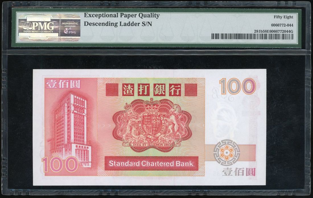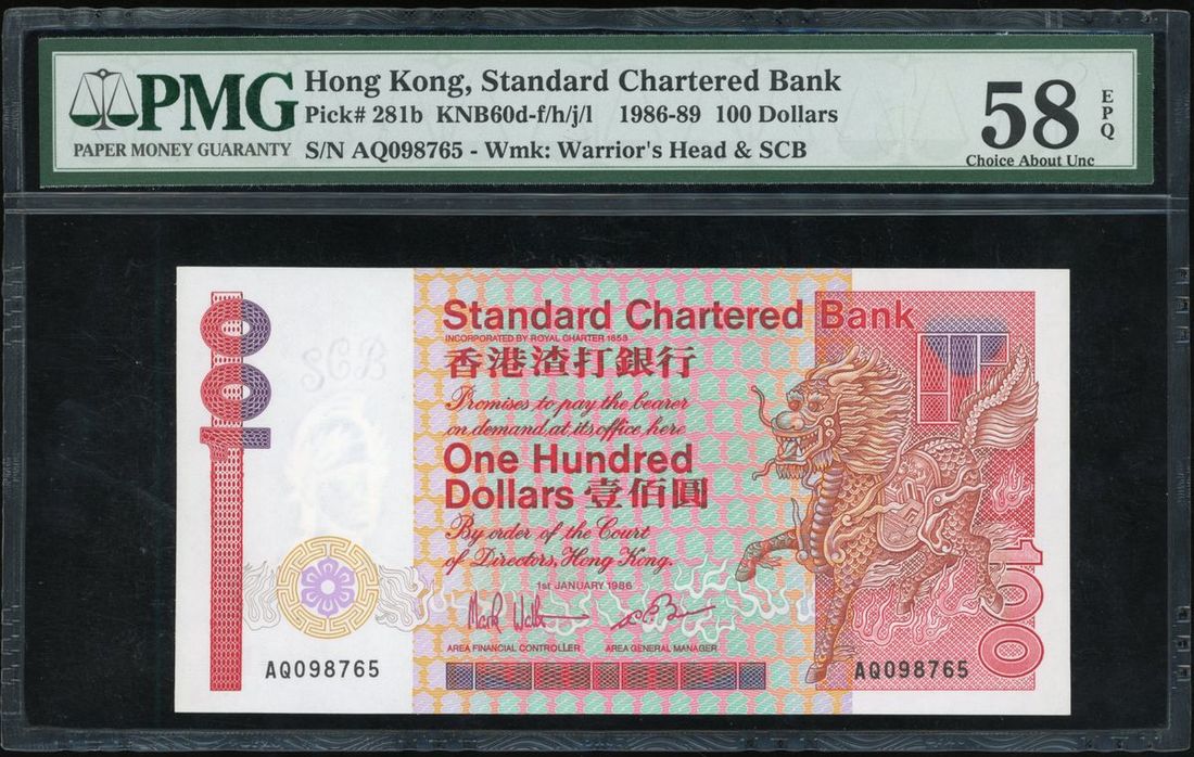 Standard Chartered Bank, $100, 1.1.1986, descending ladder serial number AQ098765, (Pick 281b), PMG 58EPQ Choice About Uncirculated.