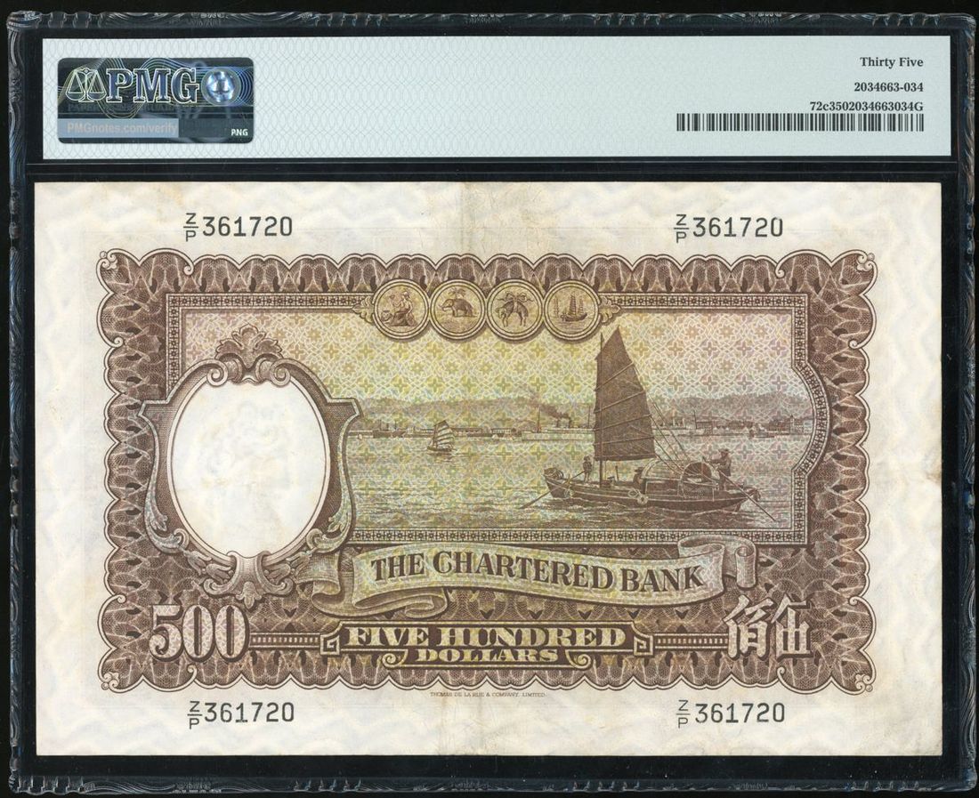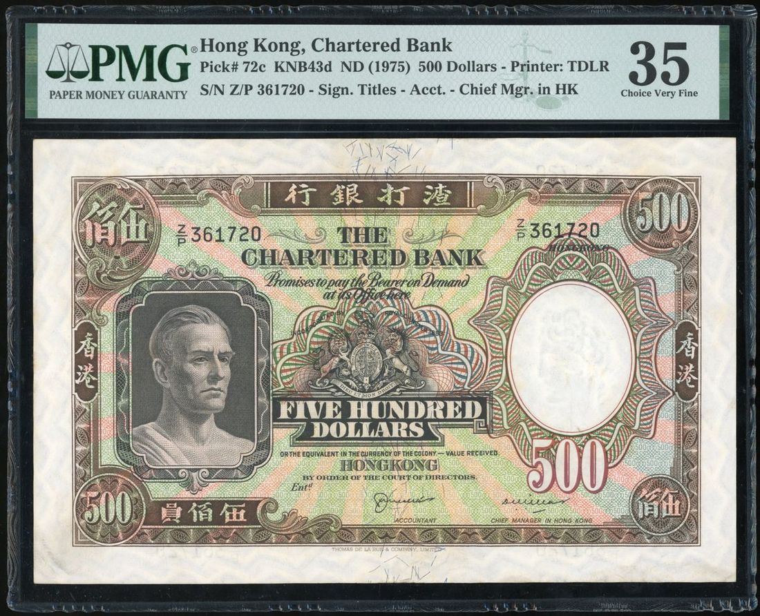 Chartered Bank, Hong Kong, $500, ND (1975), serial number Z/P 361720, (Pick 72c), PMG 35 Choice Very Fine. Though circulated, a well preserved example.