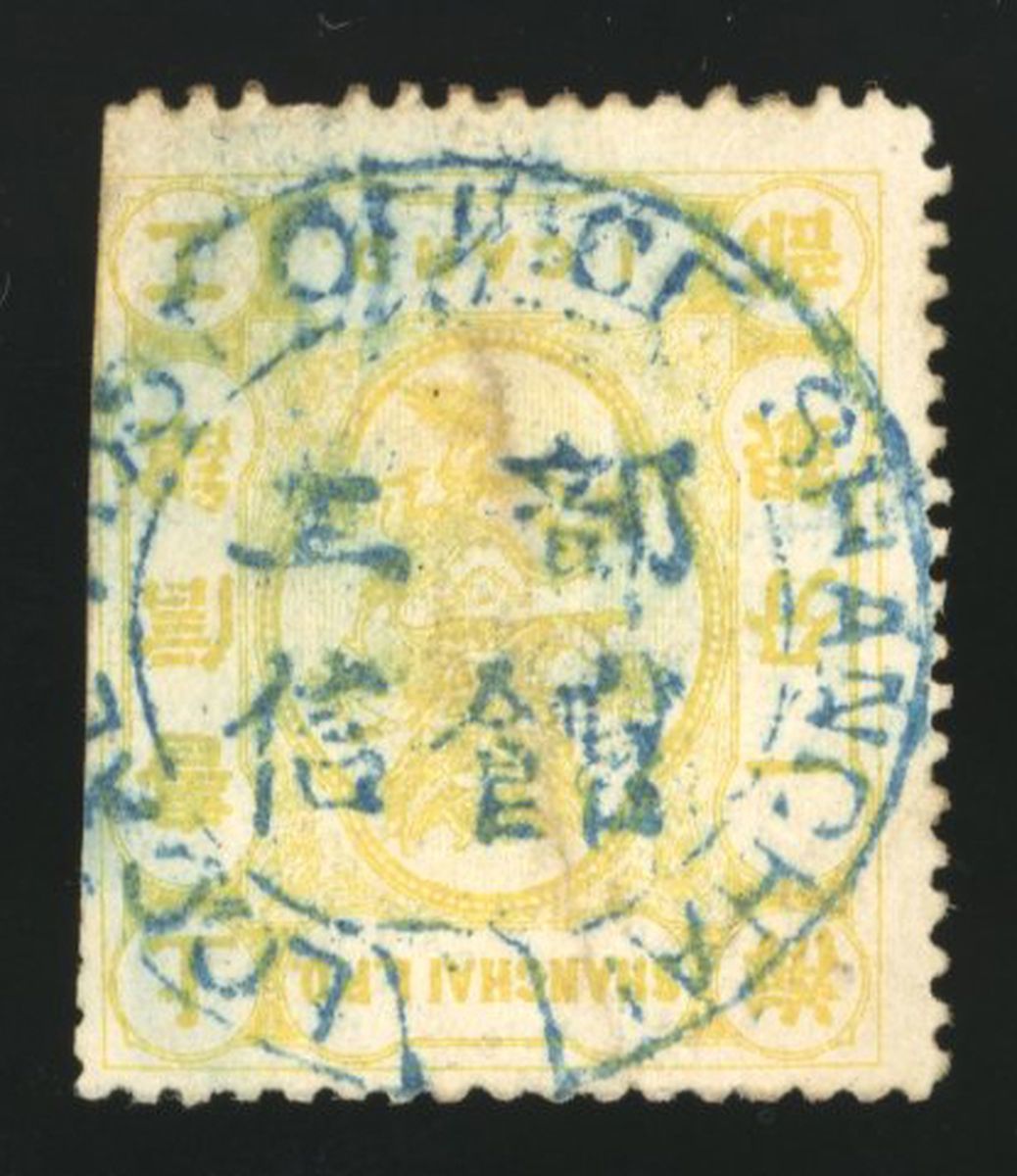 1875年上海工部第四版小龍1分舊票1枚,銷藍色上海工部信館中英文全戳,郵票右部剪齒,整體上中品