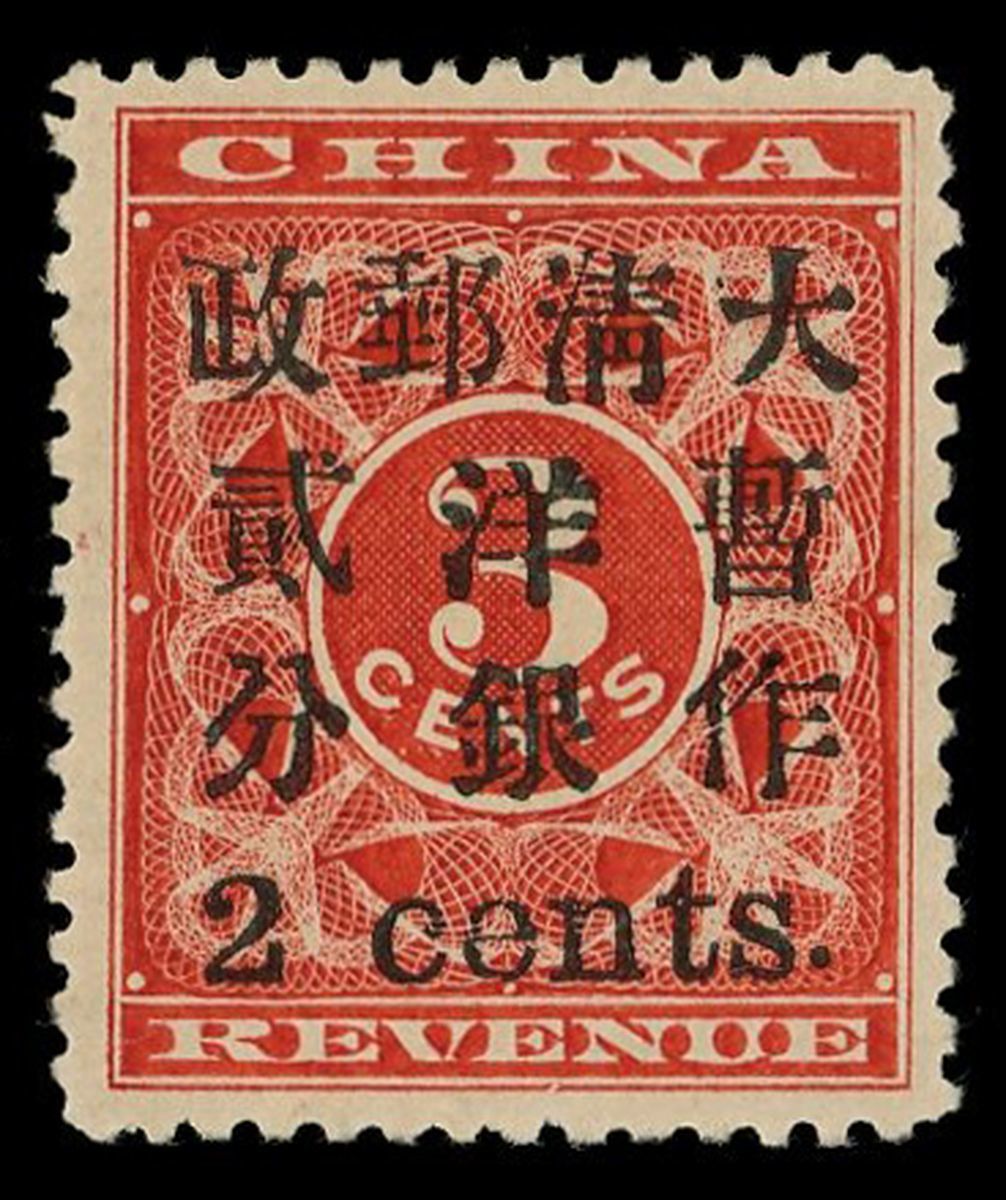1897年紅印花加蓋小字暫作洋銀貳分新票1枚,加蓋3號位,“銀,清,分”小字,票面顏色鮮豔,加蓋字模清晰,齒孔完整,原膠輕貼,上中品
