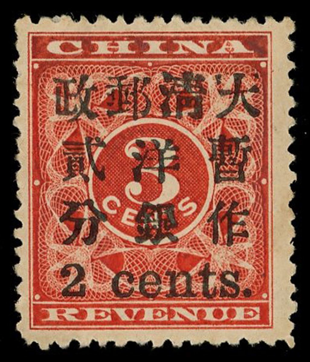 1897年紅印花加蓋小字暫作洋銀貳分新票1枚,加蓋6號位,“作,銀”小字,票面顏色鮮豔,加蓋字模清晰,齒孔完整,原膠輕貼,上中品