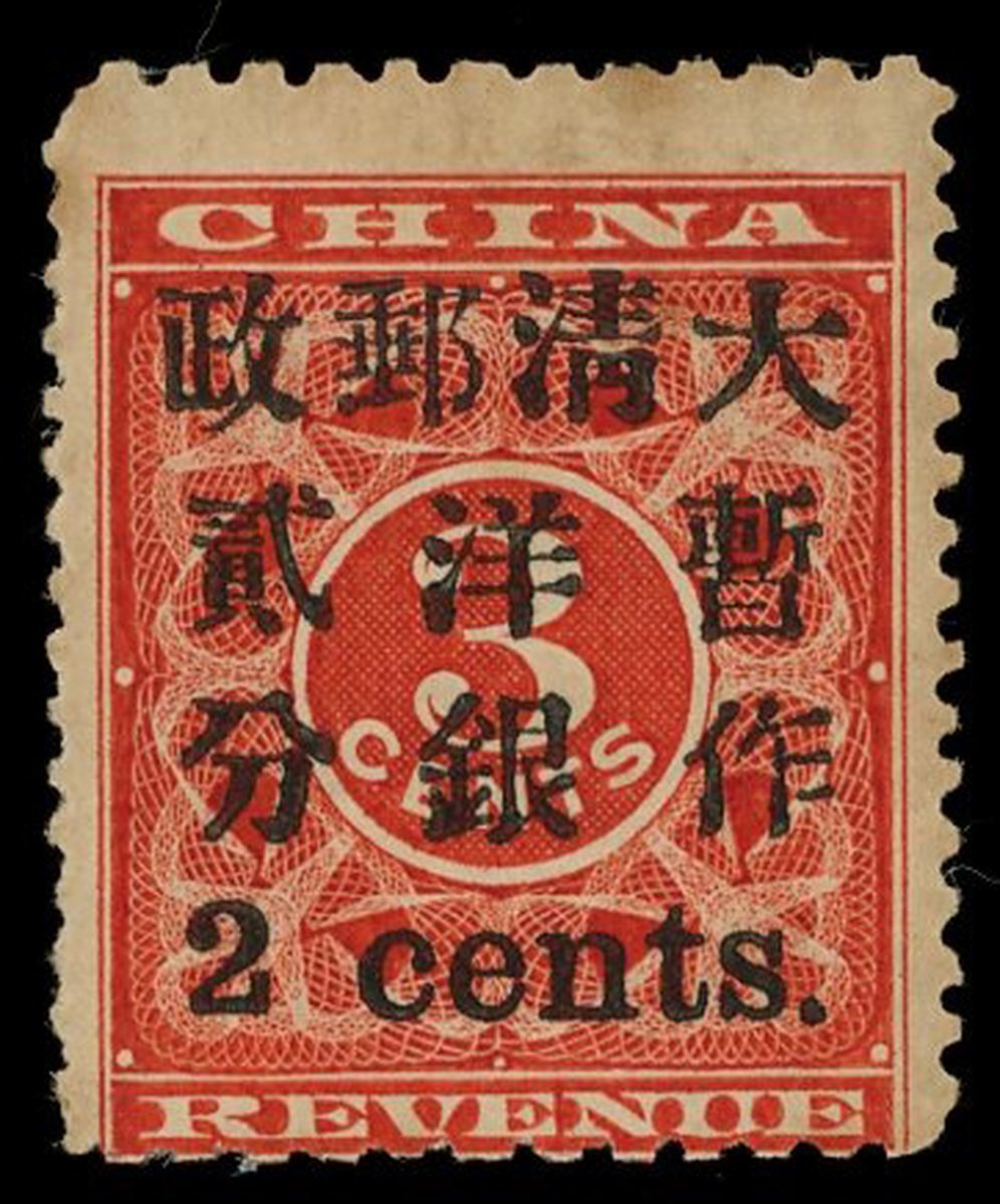 1897年紅印花加蓋小字暫作洋銀貳分新票1枚,加蓋7號位,“作”字單人旁豎彎曲,票面微黃,加蓋字模清晰,齒孔完整,原膠輕貼,上中品