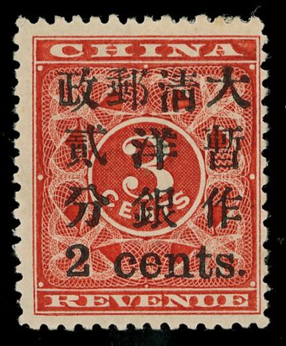 1897年紅印花加蓋小字暫作洋銀貳分新票1枚,加蓋8號位,“清,作”小字,票面顏色鮮豔,加蓋字模清晰,齒孔完整,原膠輕貼,上中品