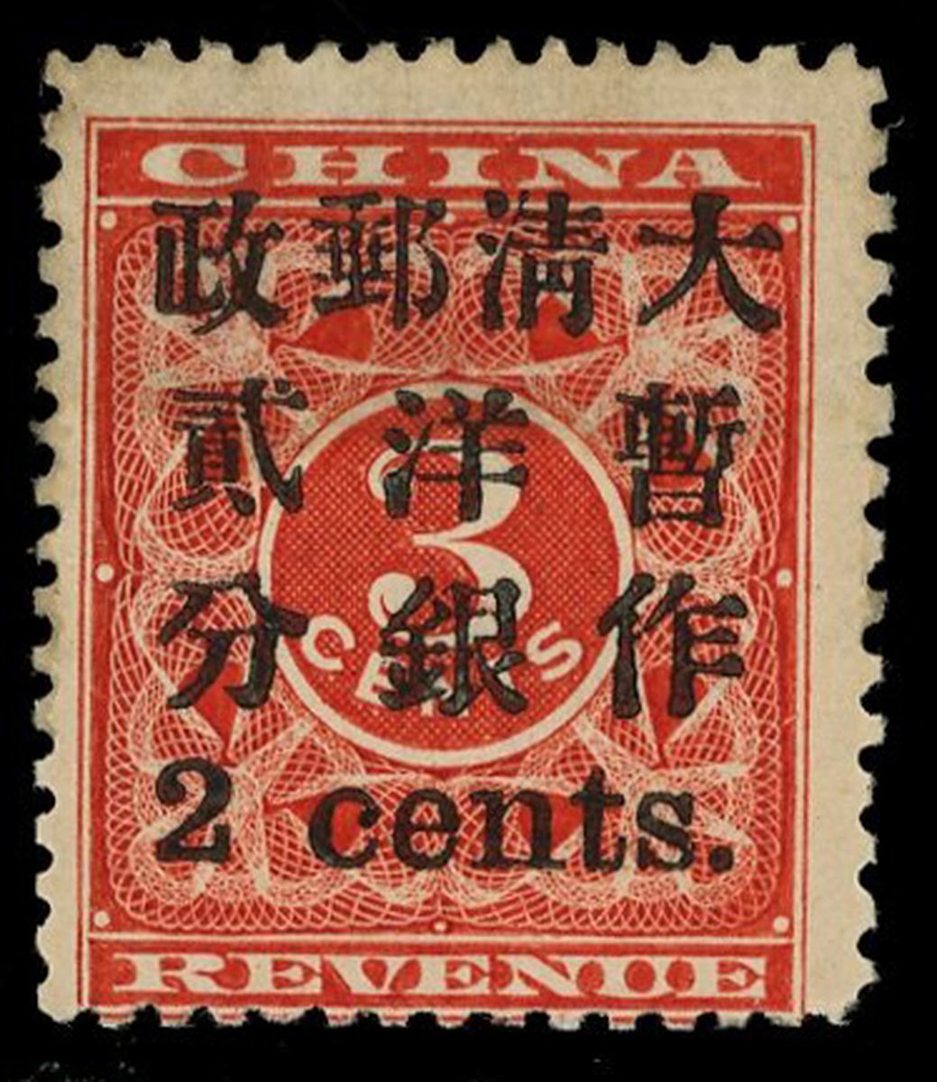 1897年紅印花加蓋小字暫作洋銀貳分新票1枚,加蓋11號位,“清”小字,票面顏色鮮豔,加蓋字模清晰,齒孔完整,局部脫膠,上中品