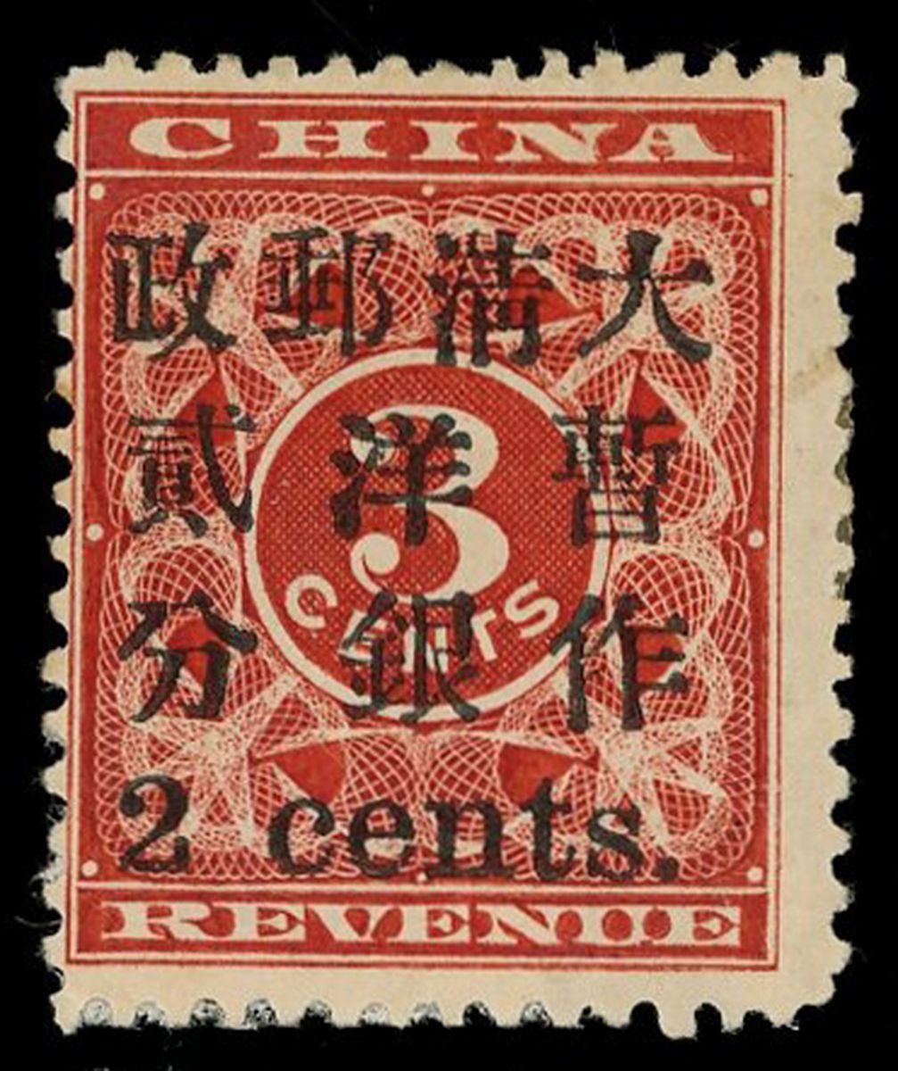 1897年紅印花加蓋小字暫作洋銀貳分新票1枚,加蓋12號位,“清”小字,“銀”右移,票面顏色鮮豔,加蓋字模清晰,齒孔完整,原膠背貼,上中品
