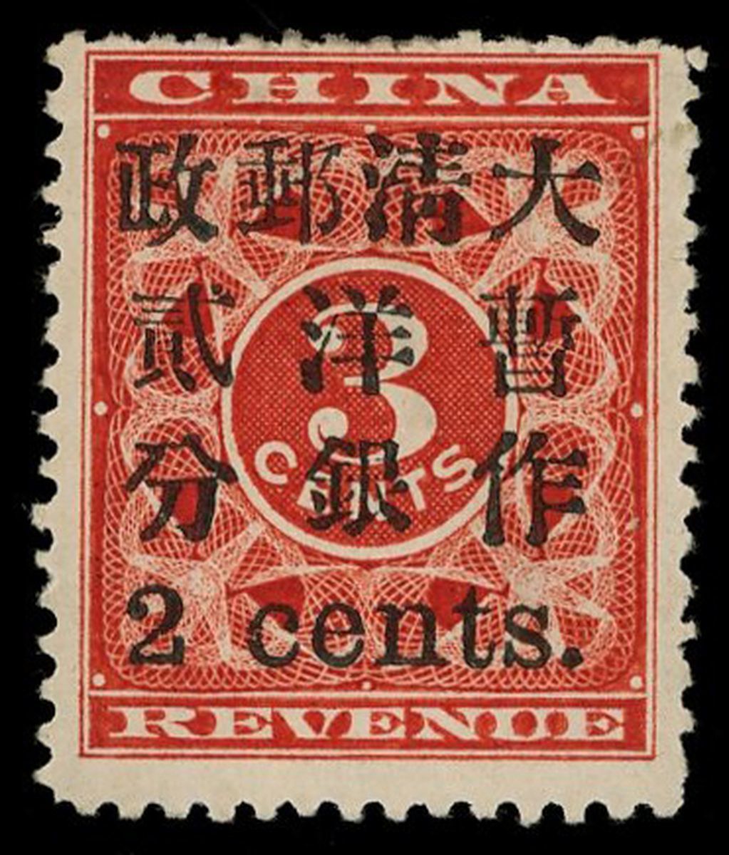 1897年紅印花加蓋小字暫作洋銀貳分新票1枚,加蓋14號位,“銀”小字,“郵,清”上平,票面顏色鮮豔,加蓋字模清晰,齒孔完整,原膠背貼,上中品