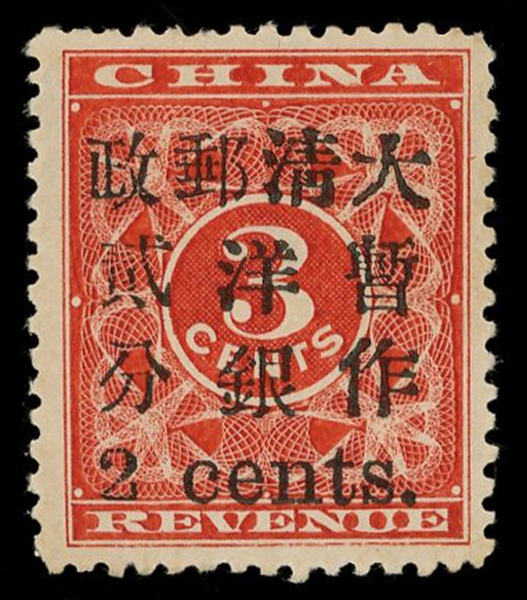 1897年紅印花加蓋小字暫作洋銀貳分新票1枚,加蓋19號位,“分”小字,票面顏色鮮豔,加蓋字模清晰,齒孔完整,原膠未貼,品相佳