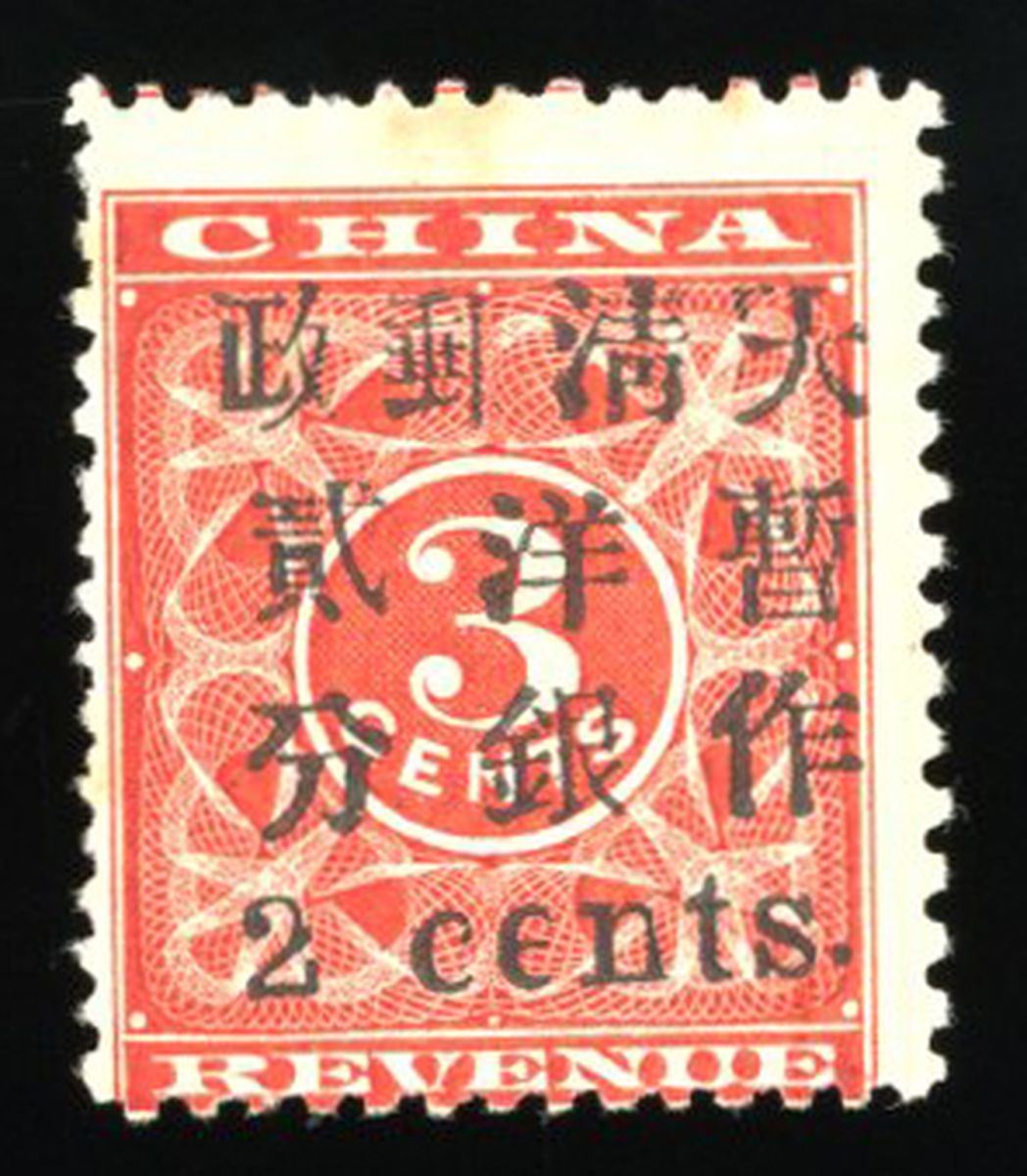 1897年紅印花加蓋小字暫作洋銀貳分新票1枚,“郵”字右側漏墨,齒孔移位入圖,票面顏色鮮豔,加蓋字模清晰,齒孔完整,原膠輕貼,上中品