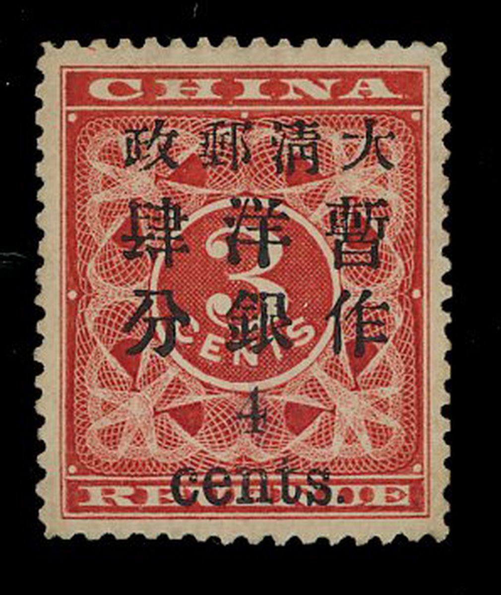1897年紅印花加蓋小字暫作洋銀肆分新票1枚,票面顏色鮮豔,齒孔完整,附英國集郵協會鑒定證書