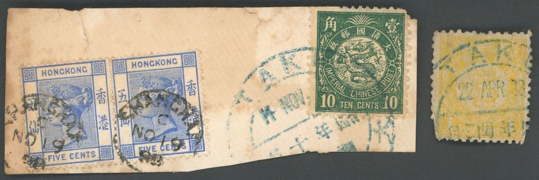 1898年銷大沽郵政局大圓戳石印版蟠龍1分舊票及剪片2件,剪片貼石印版蟠龍10分1枚,香港女王像5分2枚,香港票另銷上海11約19日英國客郵戳,整體郵戳清晰,保存完好
