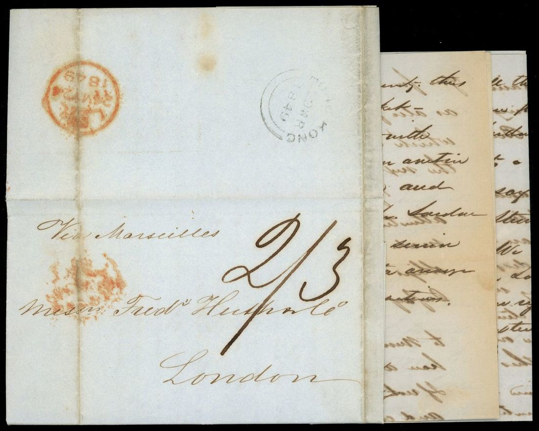 1849 (27 Mar.) An Entire letter sending from Canton to London, transited via Hong Kong, showing Hong Kong 30 MR 1849 double-arc d.s., MY 24 1849 arrival c.d.s. & hand writing rate 2/3.