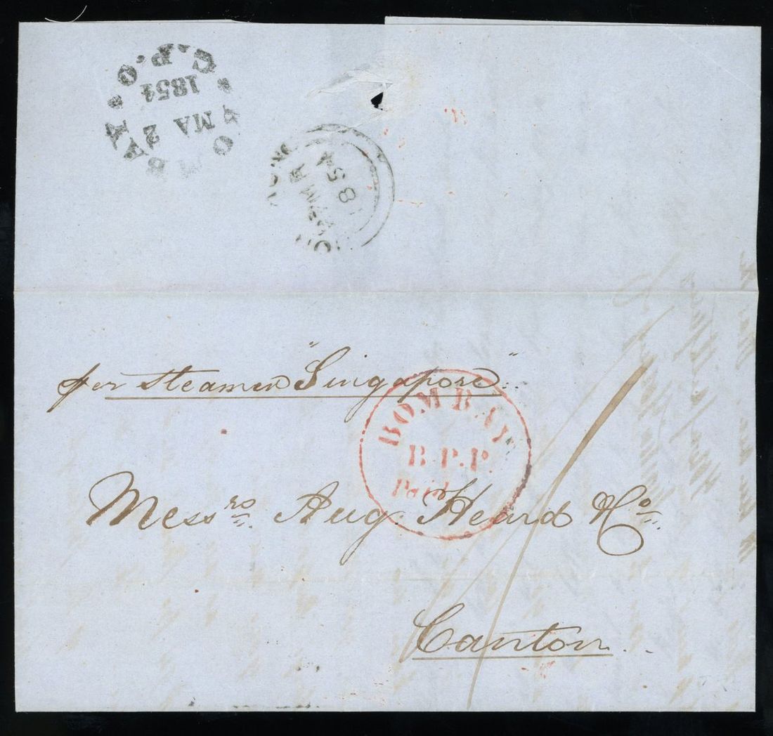 1854 (2 Mar.) entire wrapper to Canton, endorsed per steamer "Singapore", showing red circle "BOMBAY B.P.P. Paid", on reverse tied by Bombay G.P.O. (2.3) c.d.s. and double-lined Hong Kong (27.3) c.d.s., very fine.