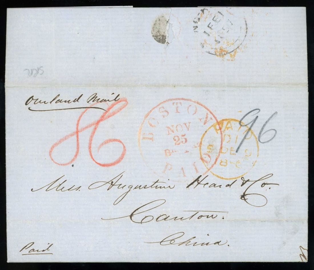 1856 (25 Nov.) incoming entire letter to Augustine Heard & Co. in Canton per overland mail, showing large single ring "Boston/Paid" c.d.s. in red, rated "86", and London (9.12) transit c.d.s., manuscript rated "96" and Hong Hong (1.2) double-arc d.s., canton (2.2) arrived, clean and very fine.