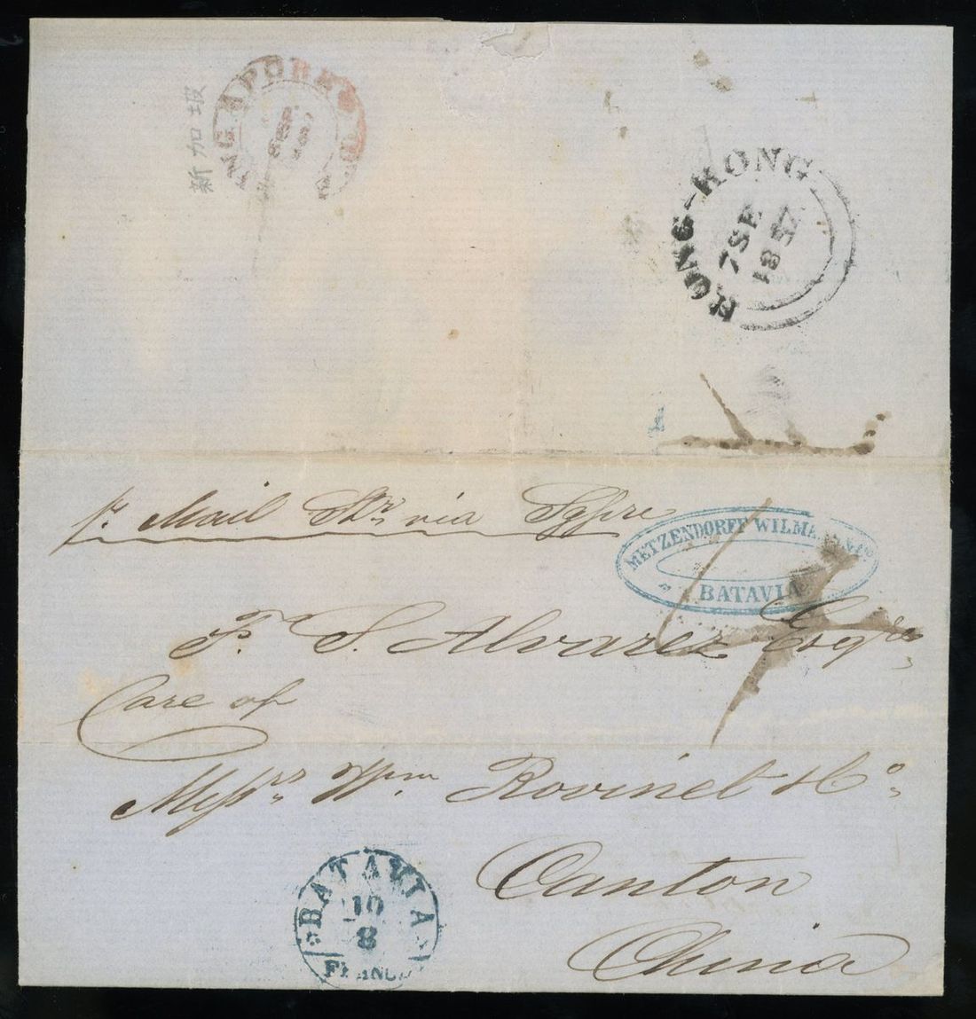 1857 (10 Aug.) entire wrapper from Batavia to Canton, endorsed per mail steamer via Singapore, showing blue oval "METZENDORFF WILMAS & Co. BATAVIA" and blue circle Batavia (10.8) c.d.s., manuscript "4" rate marking, on reverse tied by double ring Singapore c.d.s. and double-lined Hong Kong (7.9) c.d.s., very rare and a beautiful showpiece.