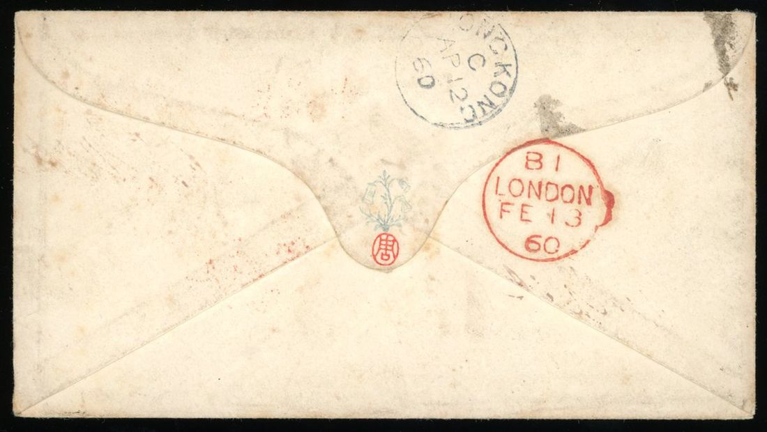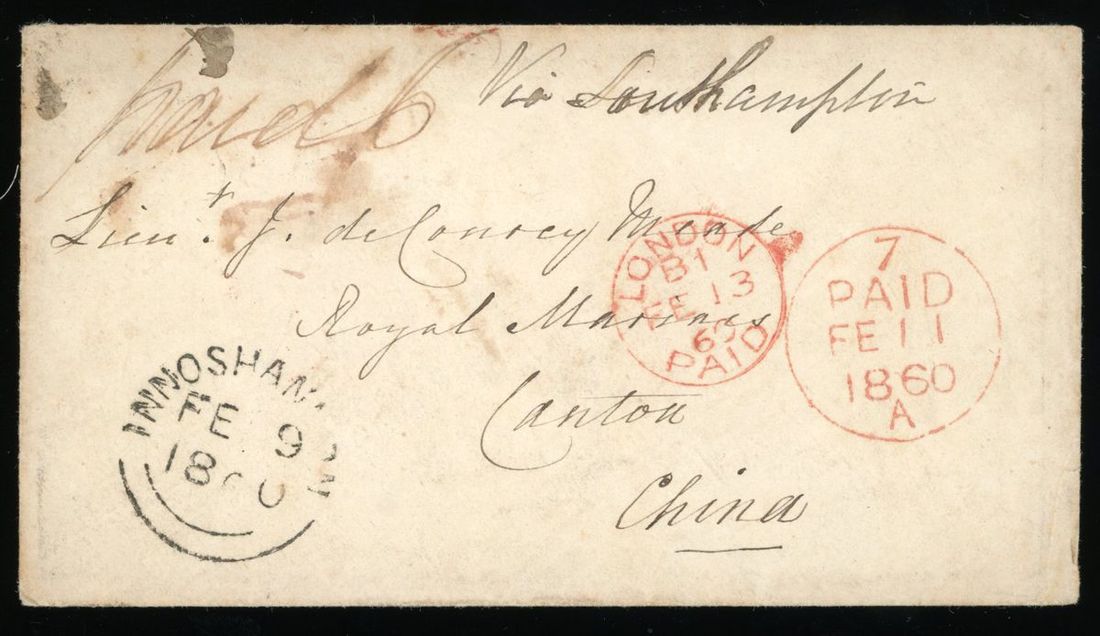 1860 (9 Feb.) envelope from Ireland to Canton, endorsed "Via Southampton" and "Paid", showing black double-ring "INNOSHANNON FE 9 1860", red "PAID FE 11 1860" and "LONDON PAID FE 13 1860" c.d.s., on reverse showing London (13.2) red c.d.s. and Hong Kong (12.4) transit c.d.s., very scarce incoming cover from Ireland, fine.