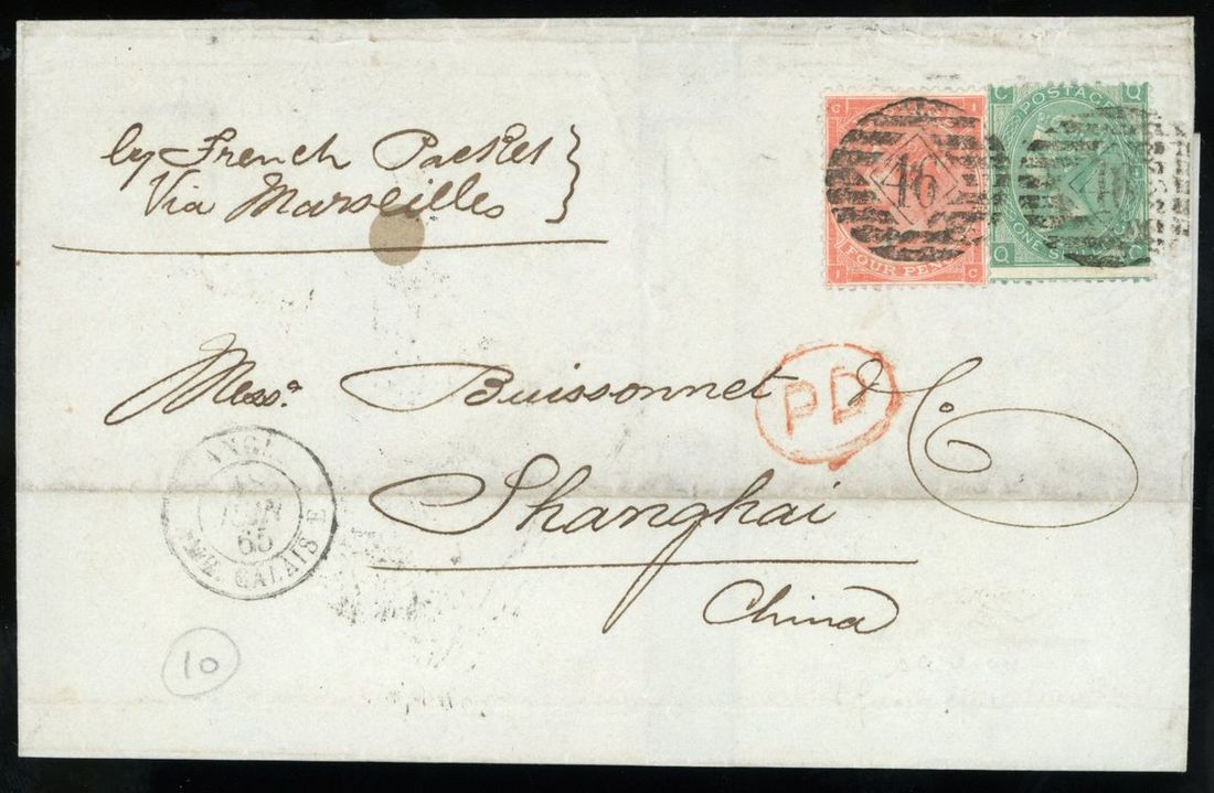 1865 (17 Jun.) commerial wrapper to Shanghai by Franch Packet via Marseilles bearing Q.V. 4d. orange and 1/- green plate 4 tied by London barred obliterates, on reverse London c.d.s., showing framed red "PD", Paris (18.6) and Calais (18.6) transit, Shanghai (31.7) arrival c.d.s., direct ship to Shanghai and no through Hong Kong more scarce, clean and fine.