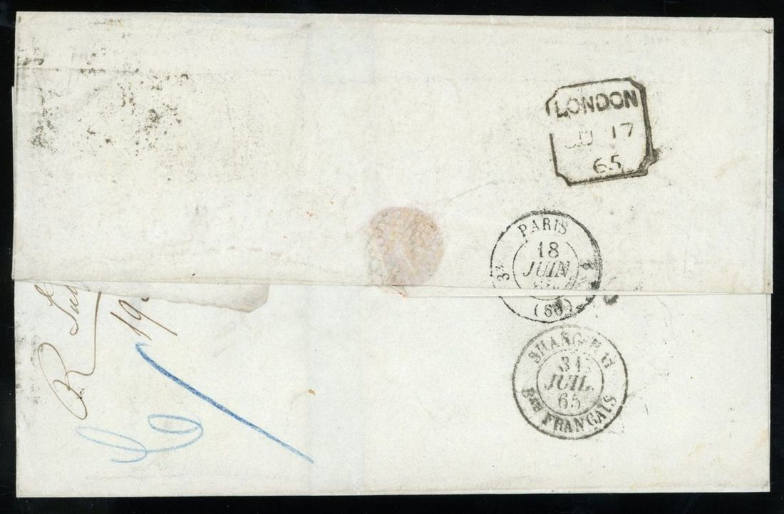 1865年英國寄上海實寄封1件,貼英國女王像1便士4便士各一枚,銷46銷票戳,另銷倫敦6月17日戳,經巴黎中轉,有巴黎18日戳,另有上海7月31日法國客郵到達戳,郵路清晰,保存完好,由英國寄上海,未經香港中轉者非常罕見