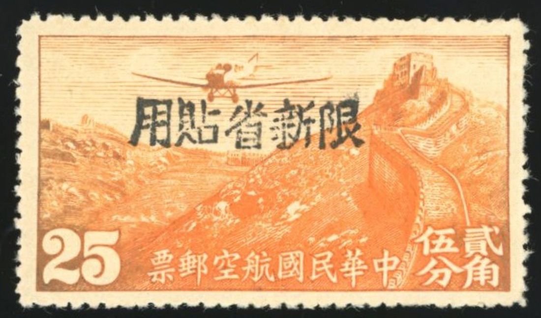 1942年北平三版航空25分木戳手蓋黑色限新省貼用新票1枚,齒孔完整,原膠,上中品