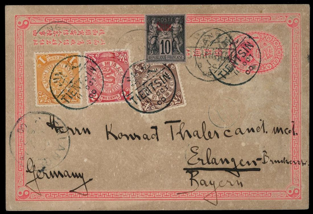 1900 (11 Oct.) 1c. card to Germany bearing CIP 1/2c., 1c. and 2c. tied by Tientsin bilingual c.d.s., in combination France overprinted "Chine" 10c. tied by "Shang-hai/Chine" c.d.s., fine.