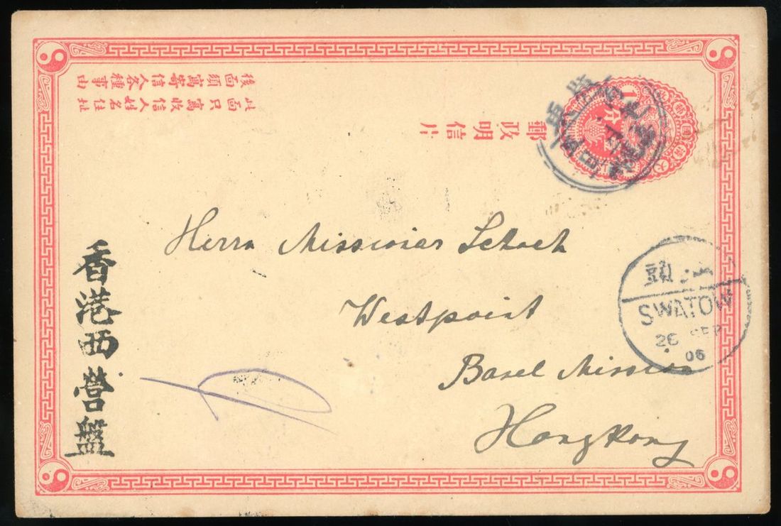 1906 (22 Sep.) 1c. card to Hong Kong tied by Kiayingchow lunar c.d.s., via Swatow (26.9), on reverse, Hong Kong (27.9) arrival c.d.s., very fine.