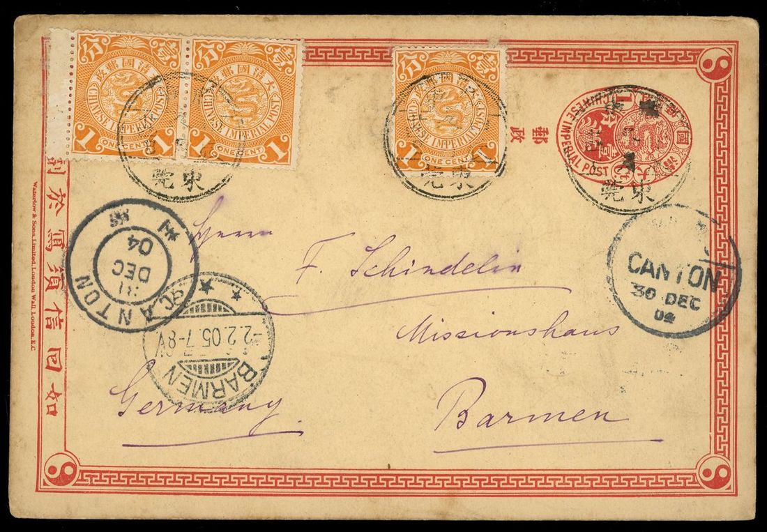 1904年廣東東莞寄德國清二次郵資雙片之去片1件,加貼倫敦版蟠龍1分3枚,銷廣東東莞甲辰冬月廿四日雙圈三格干支戳,經廣州中轉,有廣州12月30日小圓戳,廣州31日法國客郵戳,及德國2月2日到達戳,郵戳清晰,保存完好