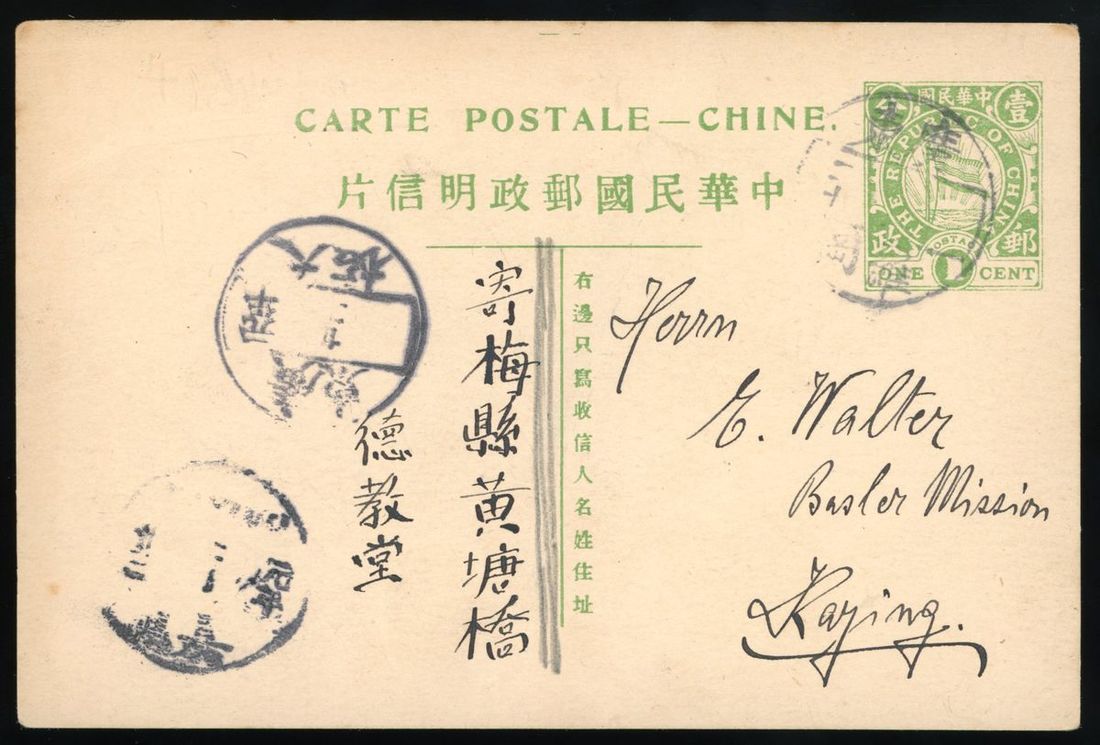 1916 (20 Feb.) Flag 1c. card to Kaying cancelled by "Luogang/ (Hung Hsien) first year" c.d.s. showing "Tato/(Hung Hsien) first year" transit c.d.s. (2.22) adjacent and next day bilingual arrival c.d.s. (2.23), fine.