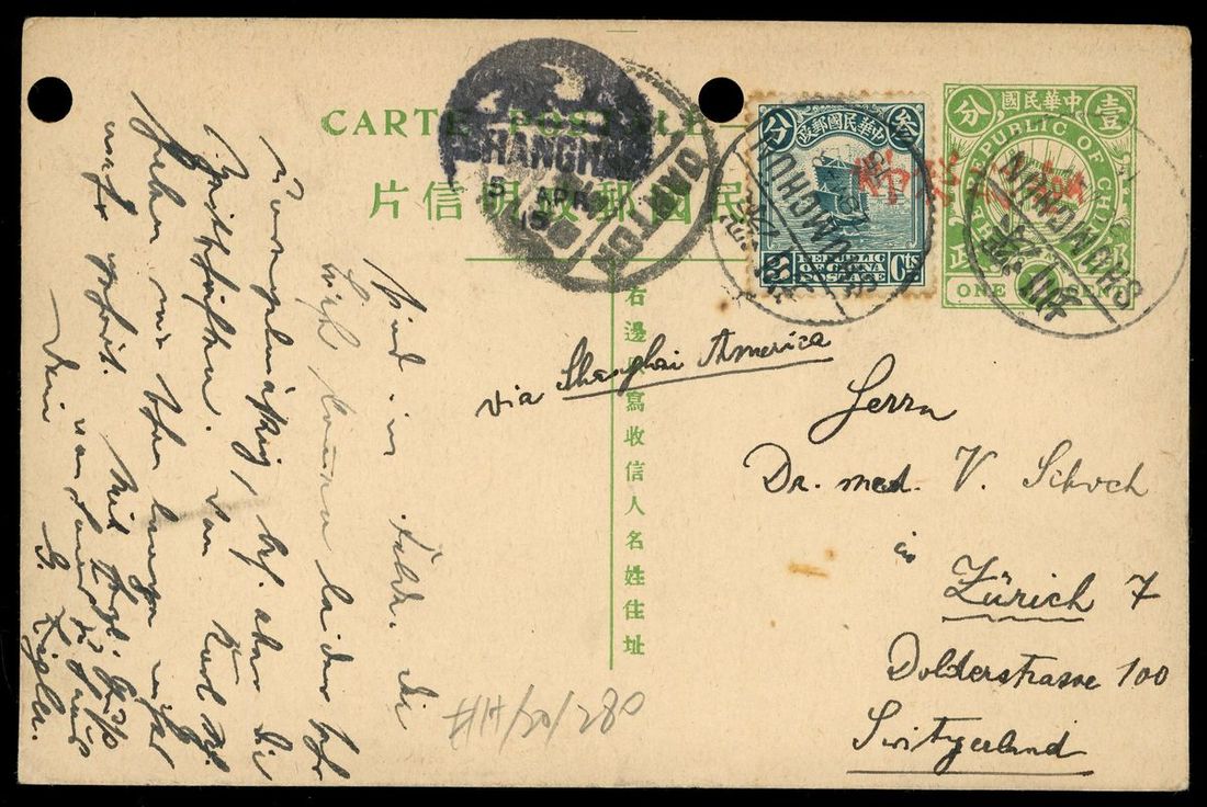 1915 (28 Mar.) missionary correspondence 1c. card to Switzerland bearing Junk 3c. tied by Shumchun bilingual c.d.s., showing Chinese Lilong church in red, via Canton and Shanghai (5.4), scarce Shumchun cancellation, two punch holes for filing.