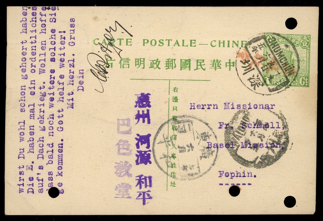 1916 (9 Jun.) missionary correspondence 1c. card to Huping tied by Shumchun bilingual c.d.s. showing Chinese Lilong church in red, via Waichow (15.6) and Huping (20.6) arrival c.d.s., pattern shifted downward variety, four punch holes for filing, fine.