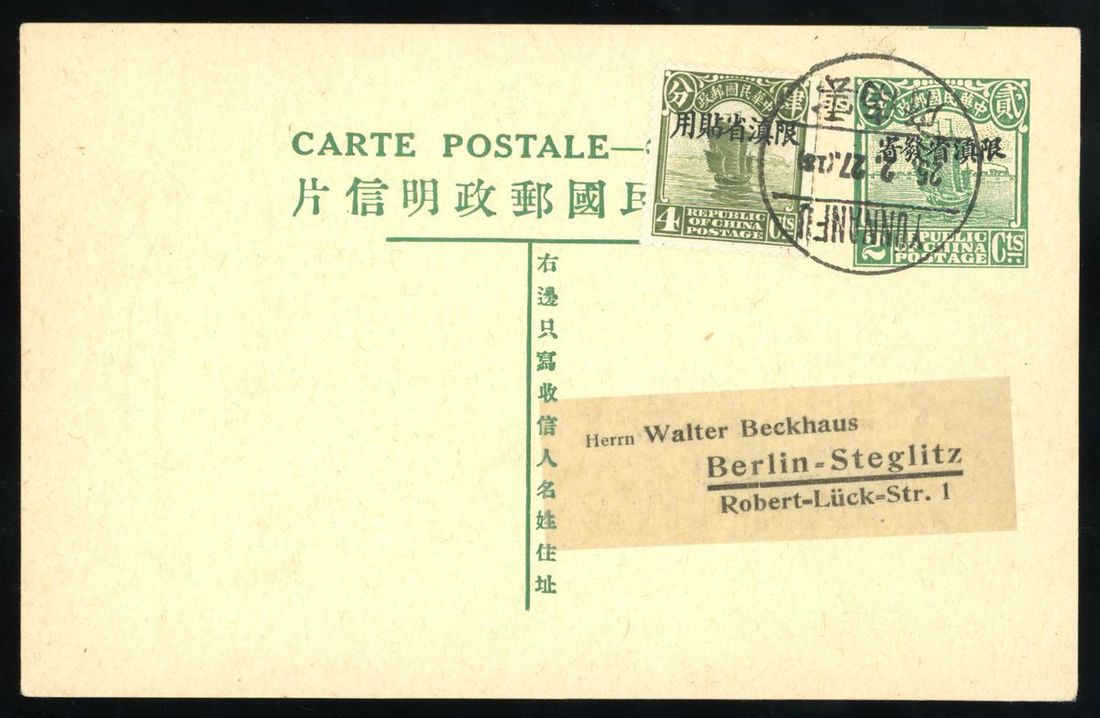 1938 (25 Feb.) Junk 2c. overprinted "Limited For use in Yunnan" stationery card to Germany, uprated with Junk 4c. ovpt. "Limited for use in Yunnan", fine.