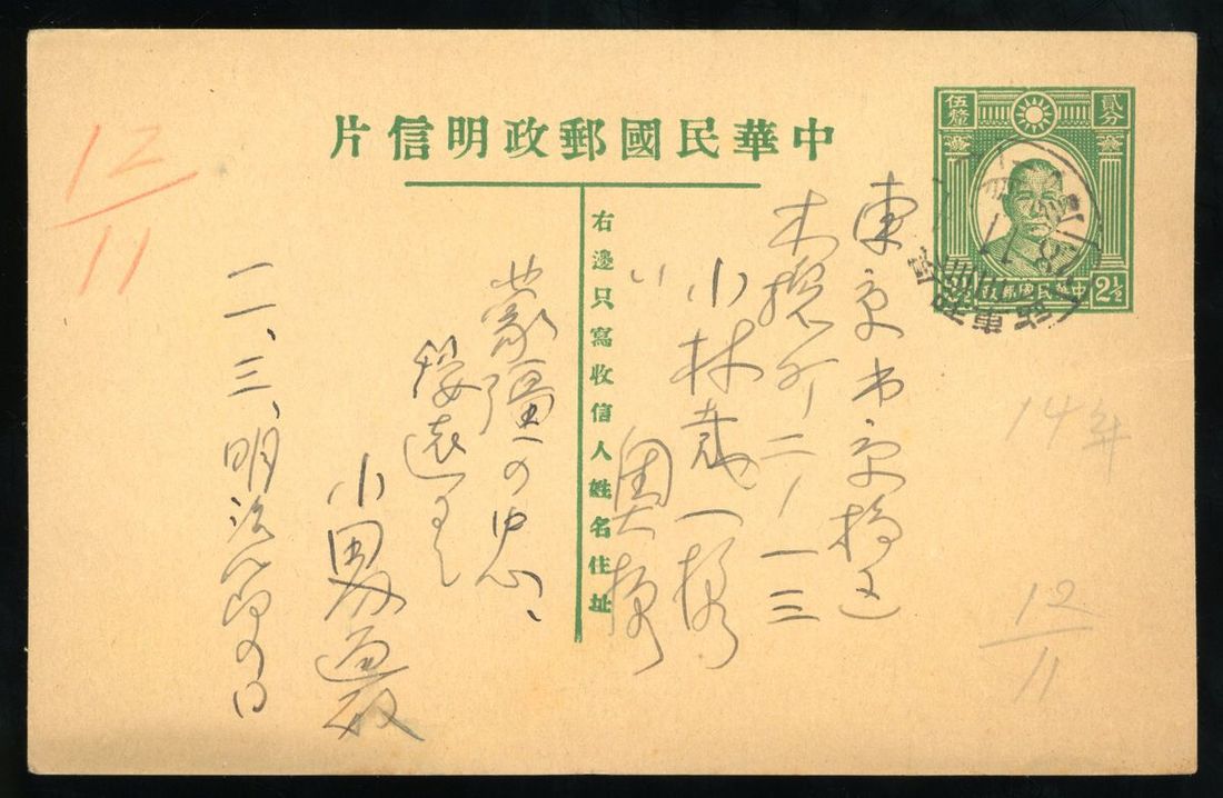 1939年厚和寄日本東京孫像2.5分郵資片1件,銷厚和車站11月4日戳,郵戳清晰,保存完好