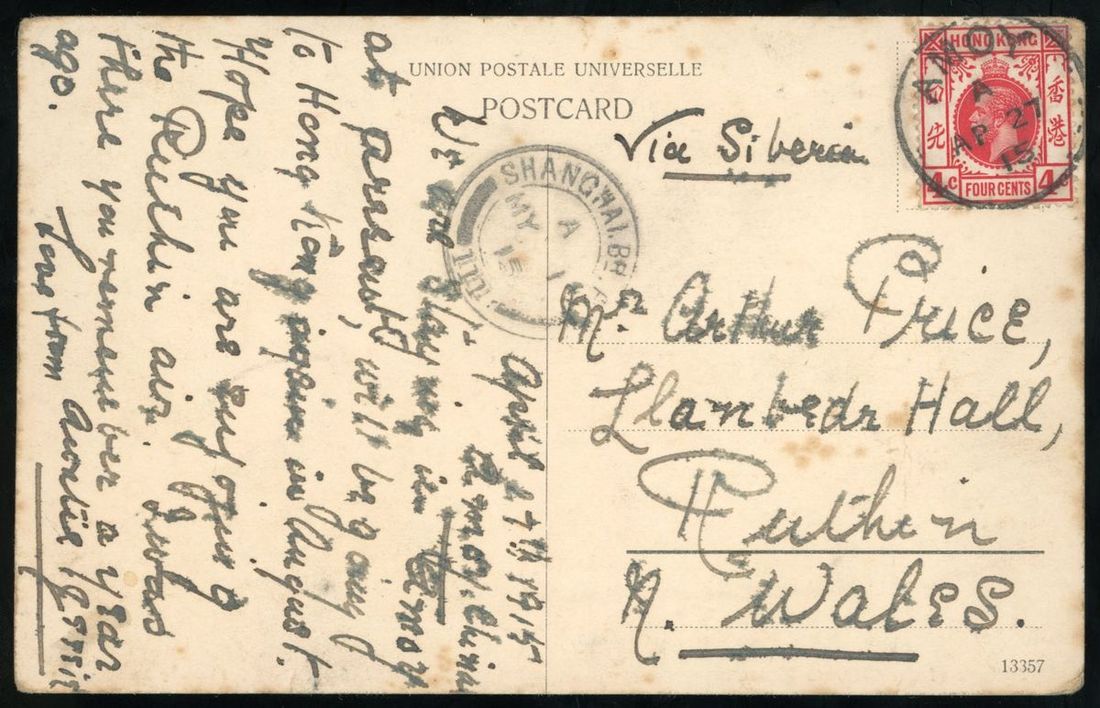 1915 (27 Apr.) picture postcard to Wales bearing K.G.V. 4c. cancelled by "Amoy/A" c.d.s., showing Shanghai B.P.O. transit c.d.s. (5.1). The back of the postcard depicts a prisoner confined in an upright cage. Typically, when sending mail from Xiamen to the United Kingdom, it would be routed through Hong Kong for overseas transit. It is unusual for this particular piece to bypass Hong Kong and travel northward via Shanghai.