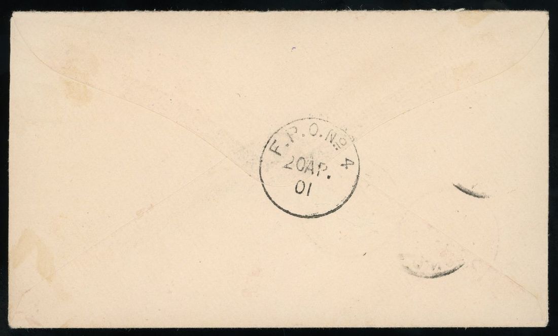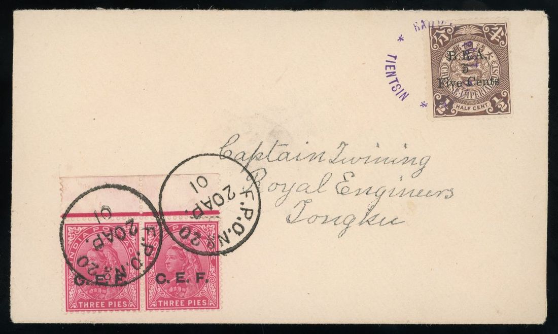 1901 (20 Apr.) "B.R.A.' surcharge in black 5c. on 1/2c. tied by "Railway Post Office/Tientsin" circular undated h.s. in violet on "Twining" envelope to Tongku, in combination with "C.E.F." 3p. pair cancelled by "F.P.O. No.20" segmented c.d.s.(20.4), with "F.P.O. No.4" c.d.s. on reverse, very fine. Chan BRA2