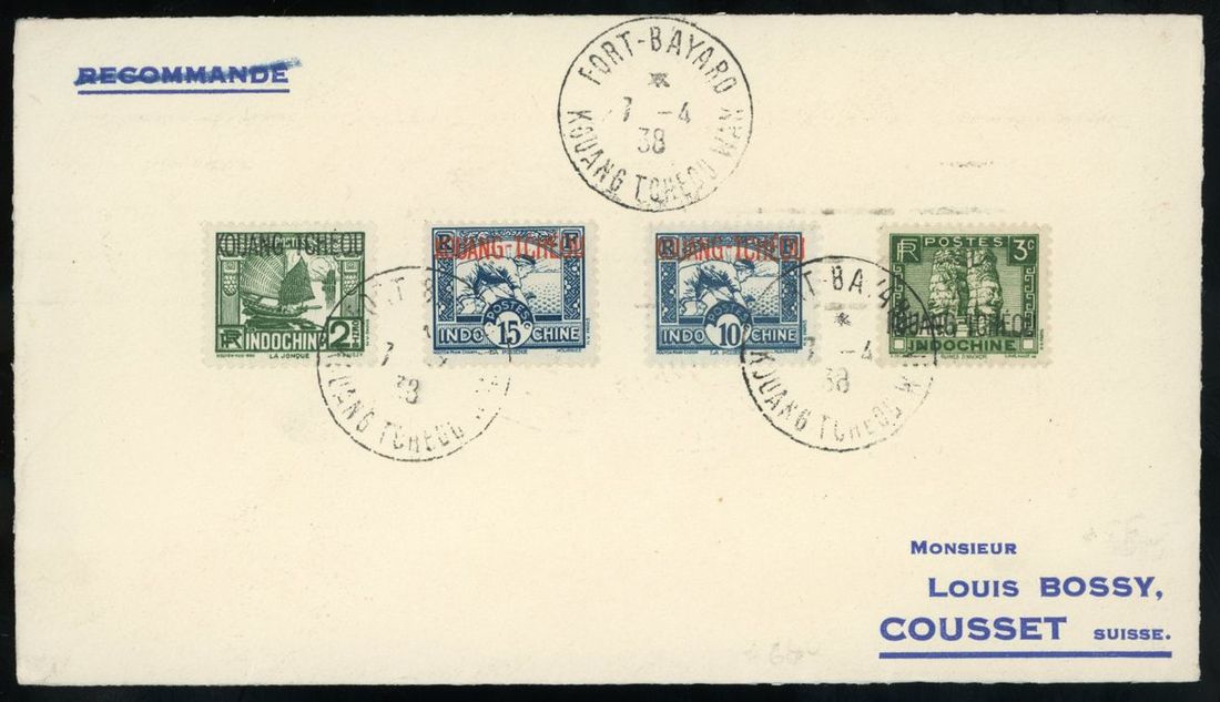 1938 (7 Apr.) envelope to Switzerland bearing "Kouang Tcheou" ovpt. 2c., 3c., 10c., and 15c. cancelled by "Fort-Bayard/Kouang Tcheou Wan" c.d.s. , with arrival c.d.s. (5.11), fine.