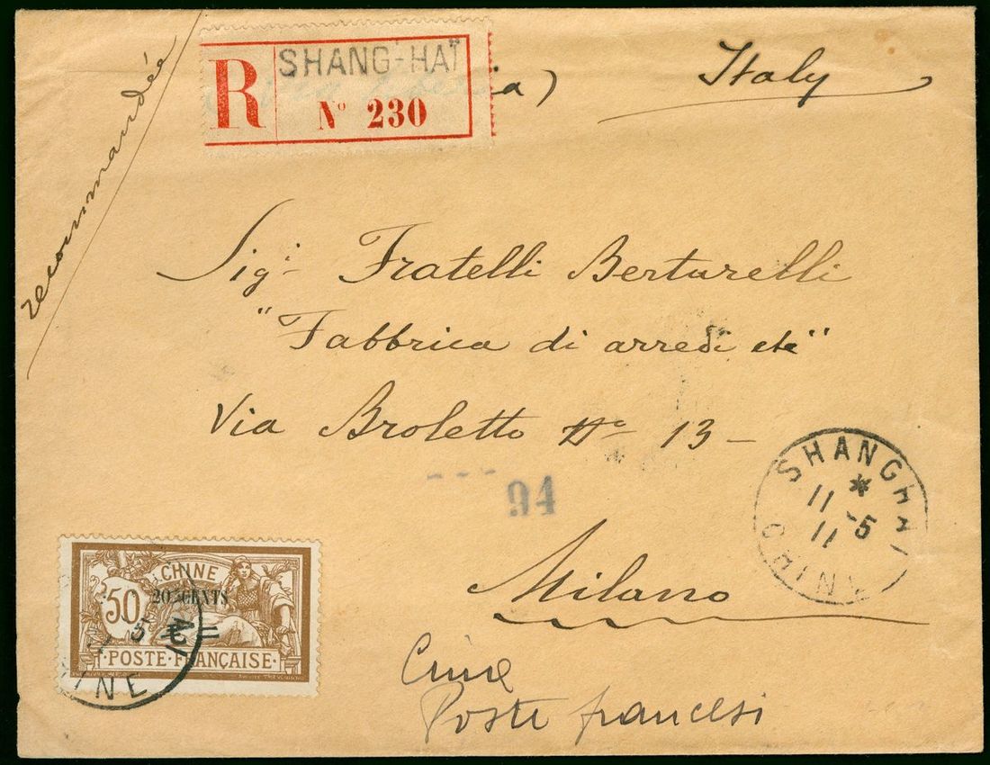 Shanghai: 1911 (11 May) envelope registered to Milan bearing 1907 20c. on 50c. tied by "