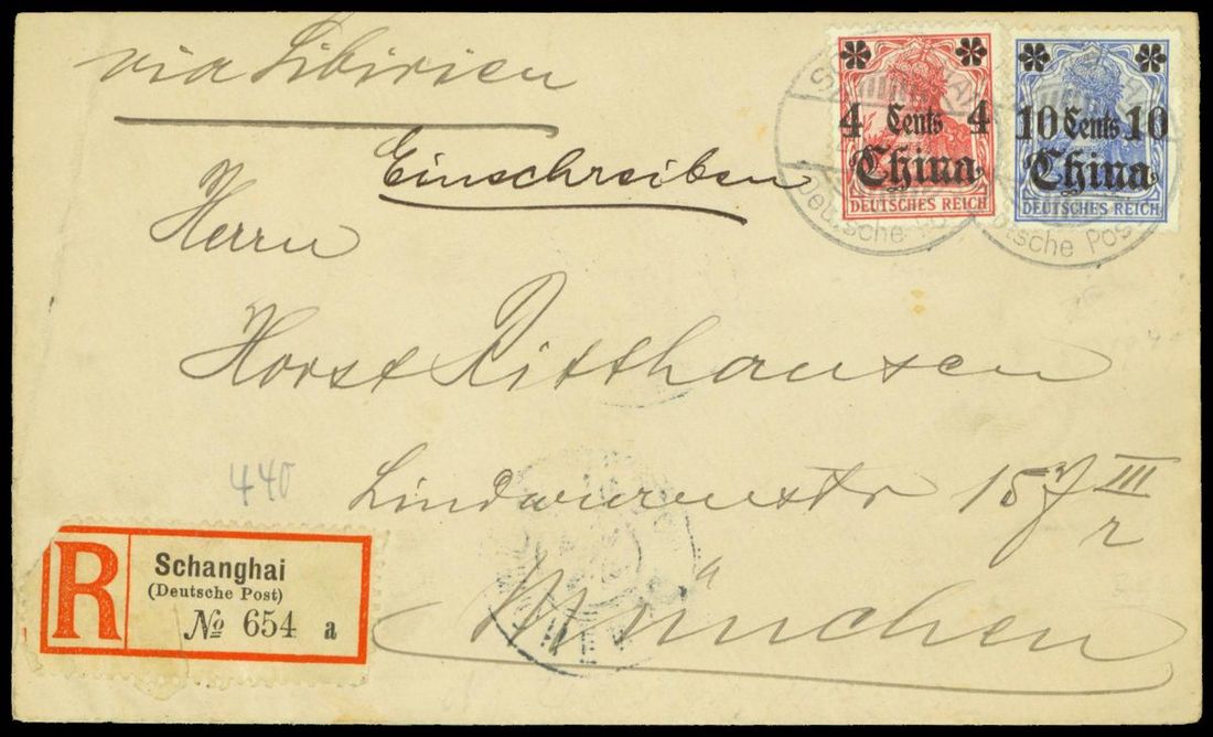 1910 (20 July) envelope registered to Munich "via Sibirien" bearing 1905 2c. on 10pf. and 10c. on 20pf. tied by "Schanghai" c.d.s. with the registration label at foot, arrival c.d.s. (6.8) on the reverse