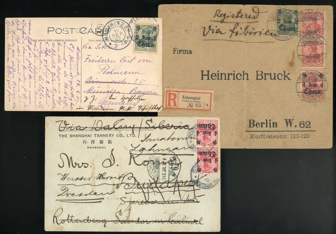 1911 registered envelope via Siberia to Berlin bearing 2c. on 5pf. , 4c. on 10pf. mixed 10pf. pair (unsurcharge) tied by "Schanghai/Deutsche Post" c.d.s., centre folded and cracked, good combination usage, plus two cover or picture postcard.