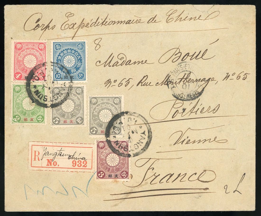 1901 (1 May) registered envelope to France bearing overprinted "China" 5r. (2), 2s., 3s., 4s. and 10s. tied by "I.J.P.O./Yangtsun" single ring c.d.s., via Yokohama (11.5) and Paris (19.6) transit c.d.s., only known registered usage, a scarce and desirable cover.