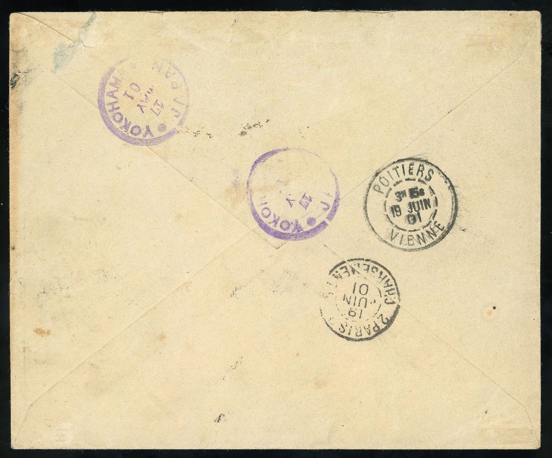 1901年楊村寄法國掛號封1件,貼日本菊切手加蓋支那2錢3錢4錢10錢各一枚,10錢2枚,銷楊村5月10日日本客郵戳,經橫濱中轉有17日戳,法國巴黎6月19日戳,及同日到達戳,保存完好