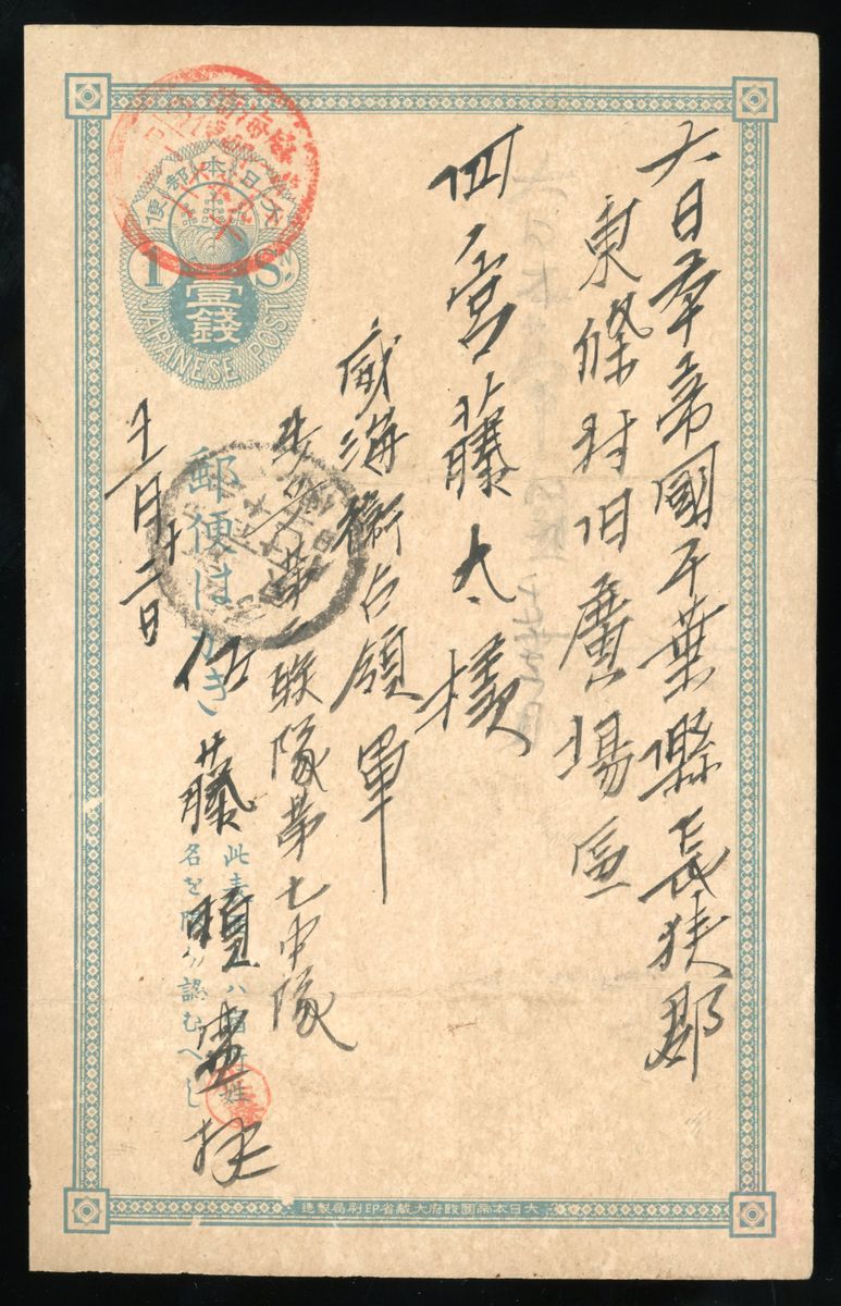 1906 (12 Nov.) Japanese Post 1s. stationery card to Japan tied by Wei-Hai-Wei Military No.1 post office in red, scarce.