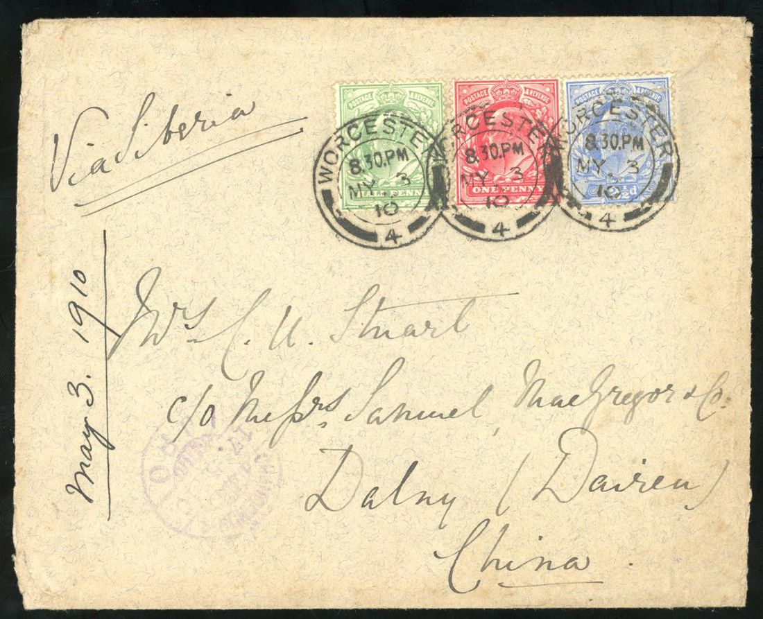 1910 (3 May) incoming envelope to Dairen "Via Siberia" bearing KEVII 1/2p., 1p. and 2 1/2p. tied by Worcester c.d.s., showing "Changchun S/IJPO" (17.5) transit c.d.s. in blue and Dairen (19.5) arrival c.d.s. in blue, fine. Ex. Mizuhara