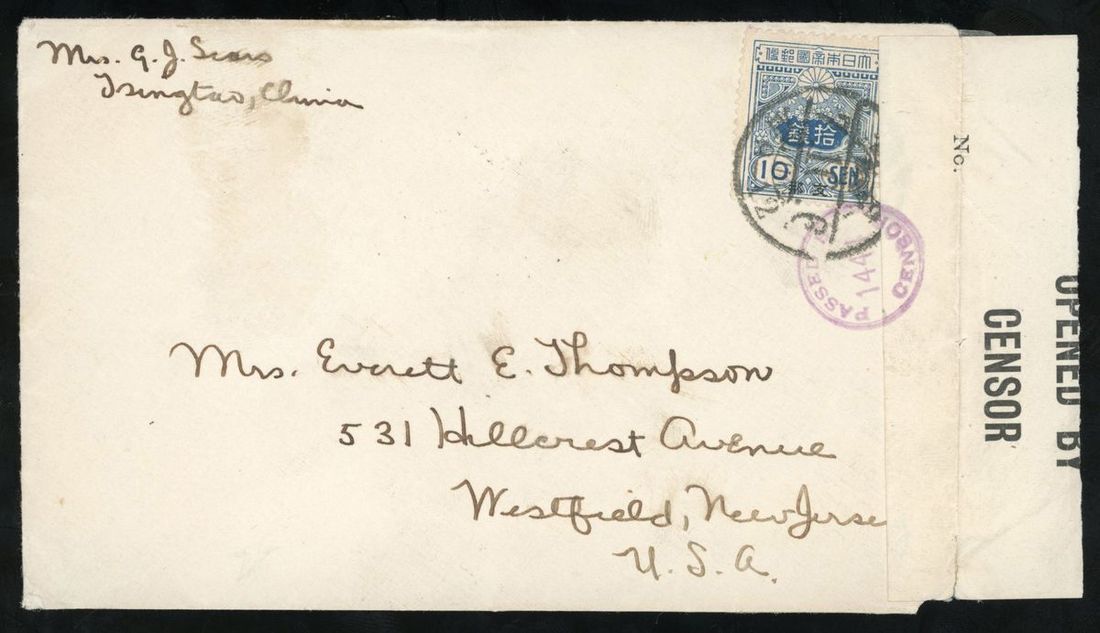 1918年青島寄美國實寄封1件,貼日本加蓋支那10錢1枚,銷青島10月6日日本客郵戳,經日本門司中轉,有門司9日戳,郵件到美國經檢查,貼檢查條,騎縫蓋檢查戳,保存完好,水源明窗先生舊藏