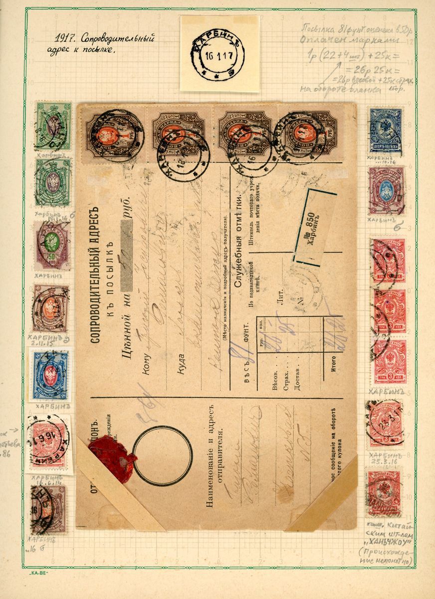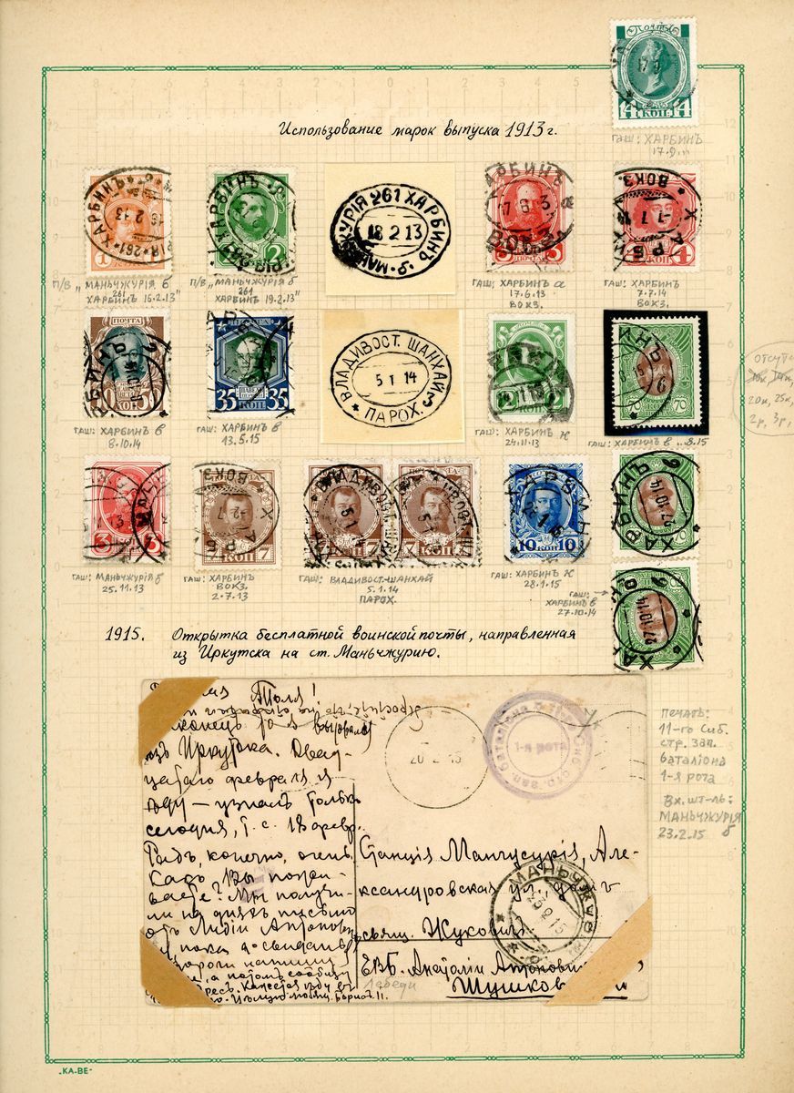 1899-1921 an unique Gold Medal collection form Vadim Ustinovsky, comprising 95 used stamps in singles, pairs, blocks plus one complete sheet with 6 labels and very scarce postal history pieces, cancellations including Harbin-Mukden, Vladivostok-Shanghai, steamship Harbin-Pristin, Kalgan border, Manchuria border and much more, also the very rare CER stations Kuanchendzy and Handackhetze markings, generally very fine.