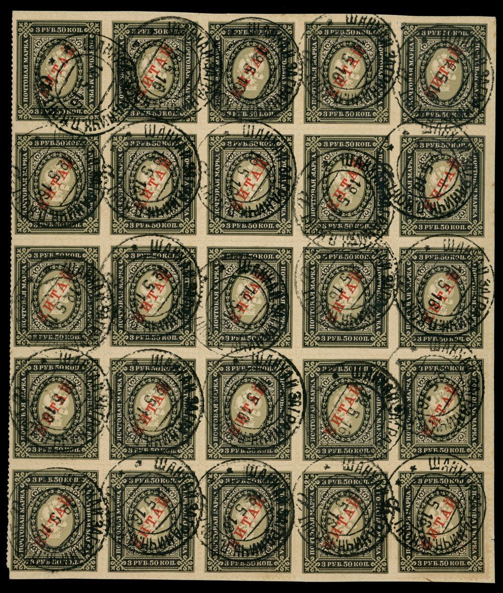 1904年俄國在華客郵3.5盧布加蓋舊票25方連剪片1件,銷上海俄國客郵局16年5月12日戳,保存完好