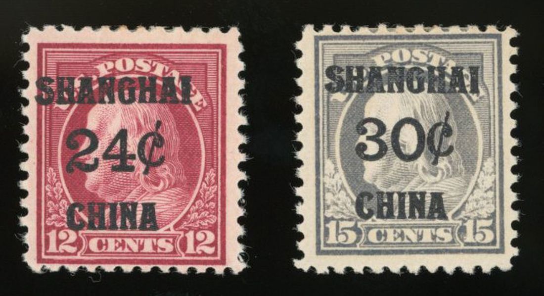 1917-22年美國在華客郵加蓋CHINA SHANGHAI改值新票12枚,包括第一次加蓋14分至2元,第二次加蓋全套,票面顏色鮮豔,加蓋字模清晰,齒孔完整,原膠背貼,上中品