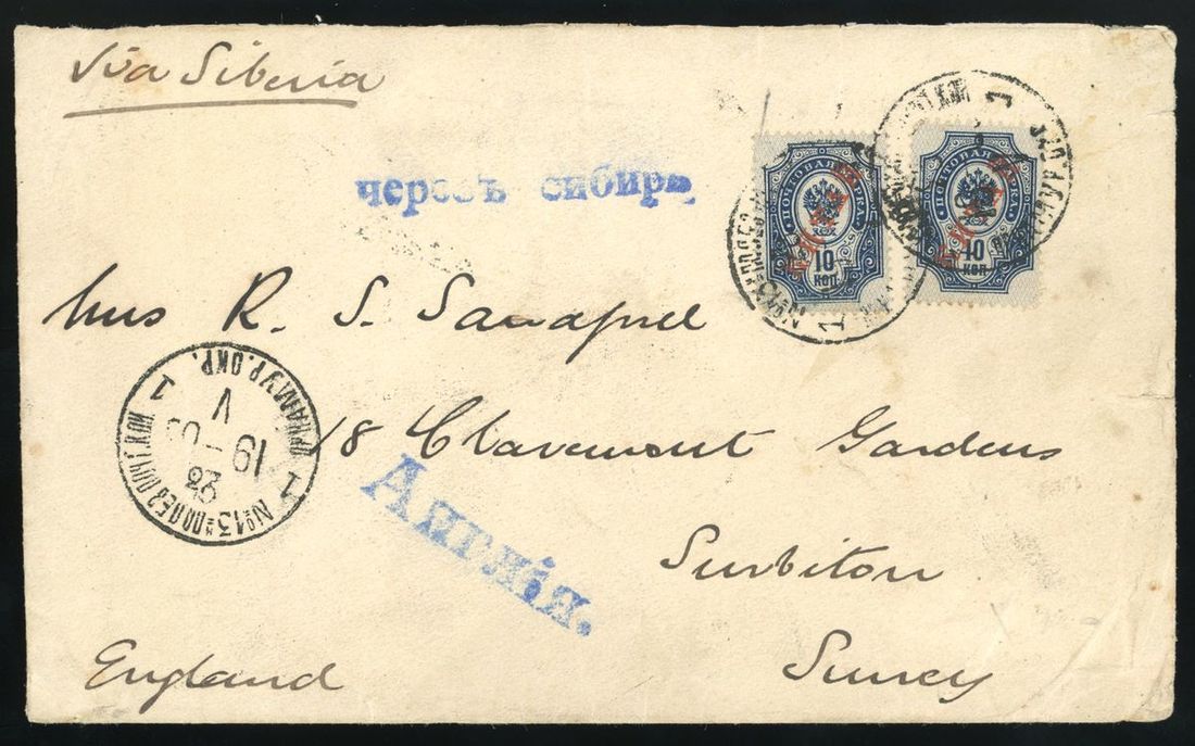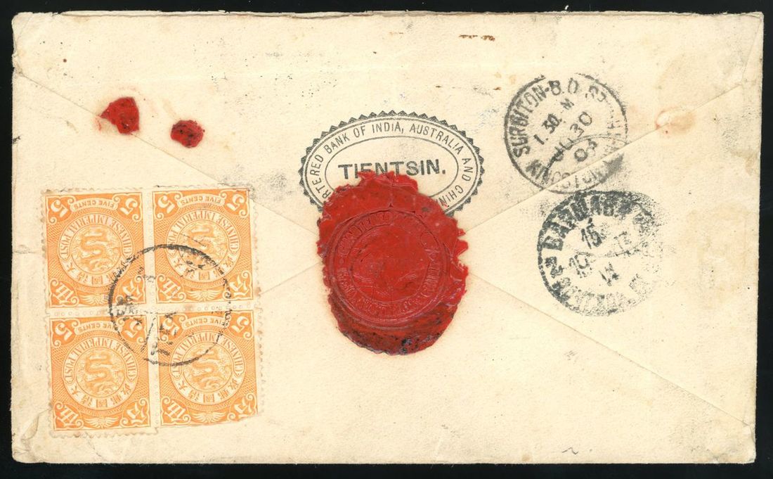 1903年天津寄英國掛號封1件,貼倫敦版蟠龍5分四方連,俄國在華客郵10戈比2枚,蟠龍銷天津小圓戳,經牛莊,俄國客郵銷5月23日俄國駐牛莊NO13軍郵戳,而後進入俄國境內中轉,有6月30日英國到達戳,封口有完整火漆,保存完好,偽西伯利亞郵路開通前史前封,少見