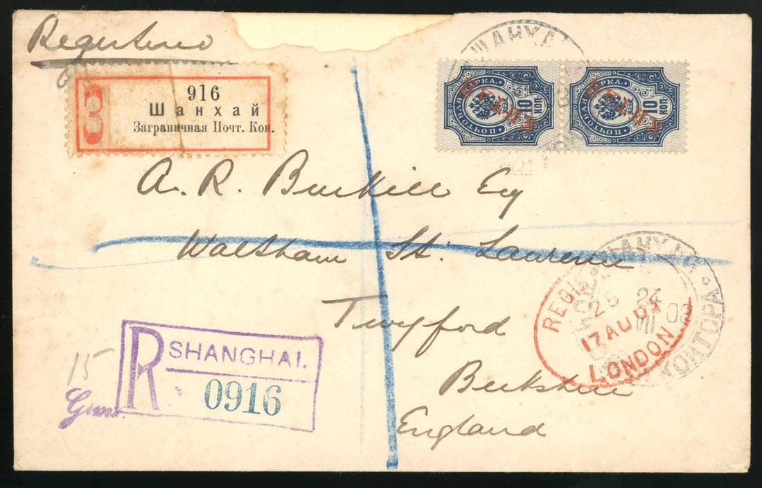1903年上海寄英國掛號封1件,貼俄國在華客郵10戈比2枚,銷上海7月24日俄國客郵戳,另貼上海俄國客郵局掛號標籤,蓋上海英文掛號戳,經莫斯科中轉有8月1日戳(俄曆),及倫敦8月17日到達戳,保存完好