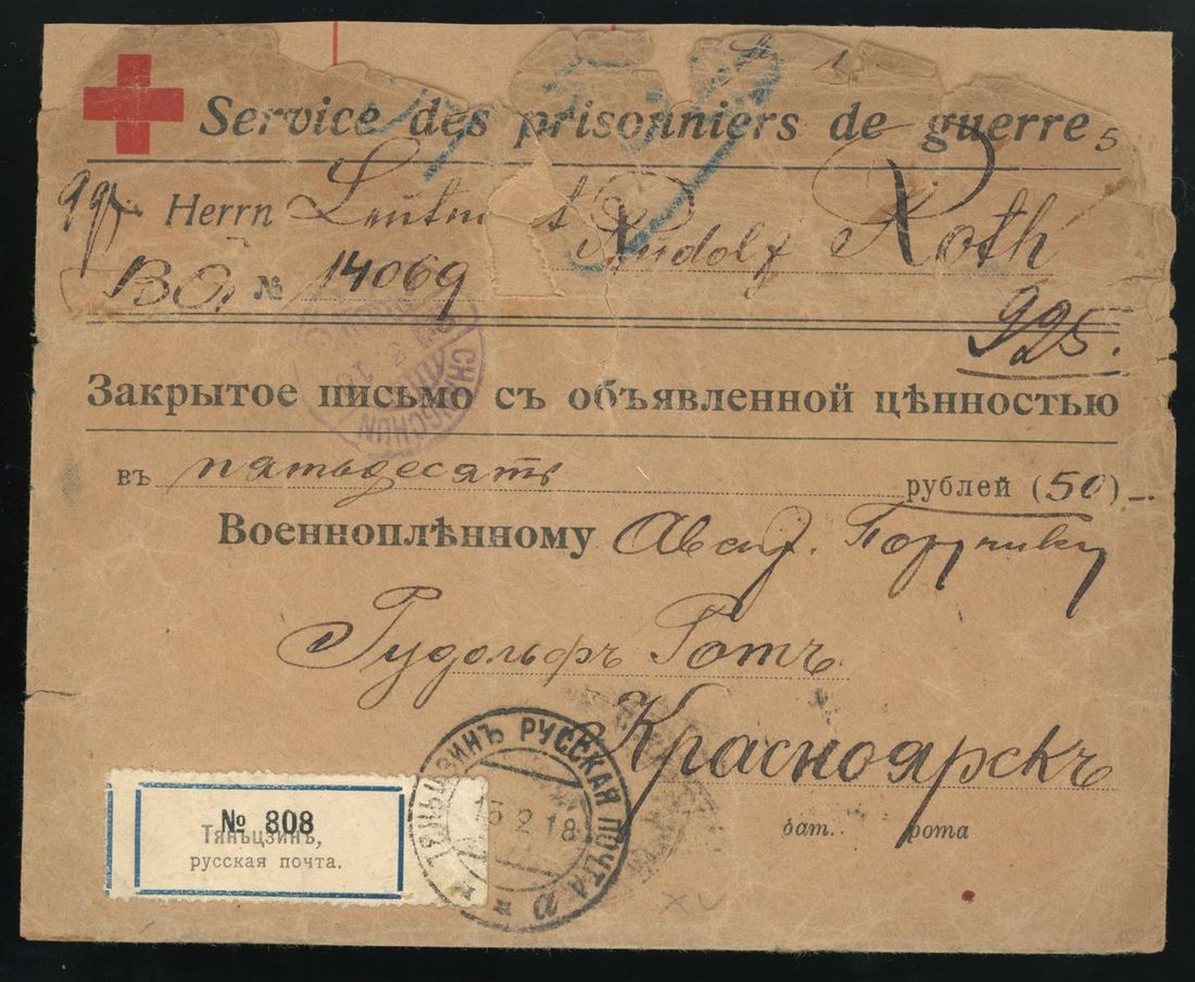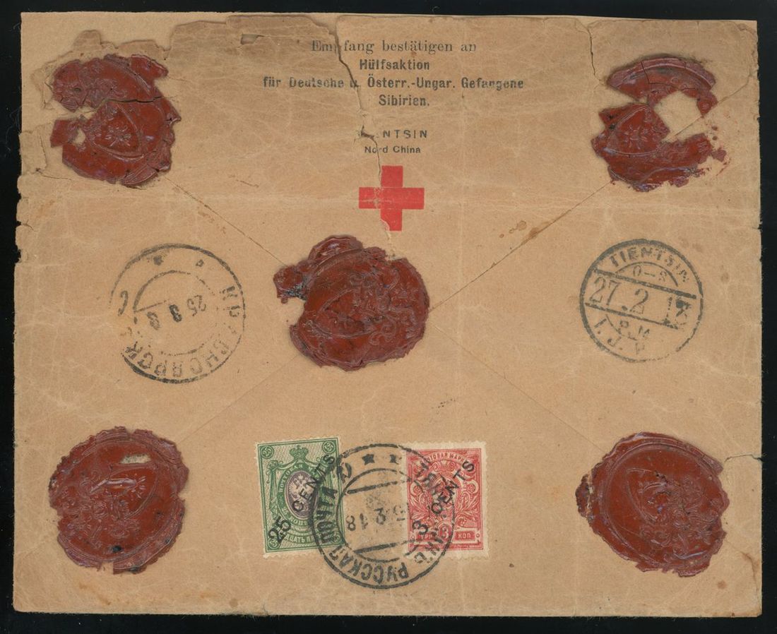 1918 (13 Feb.) registered Red Cross prisoners printed envelope from Tientsin to Krasnoyarsk, Russia (25.3) bearing Arms surcharge 3c. on 3k. and 25c. on 25k. tied by Tientsin double-ring d.s. via Japanese Post Office in Tientsin (13.2) and Changchun (27.3), cover has been repaired.