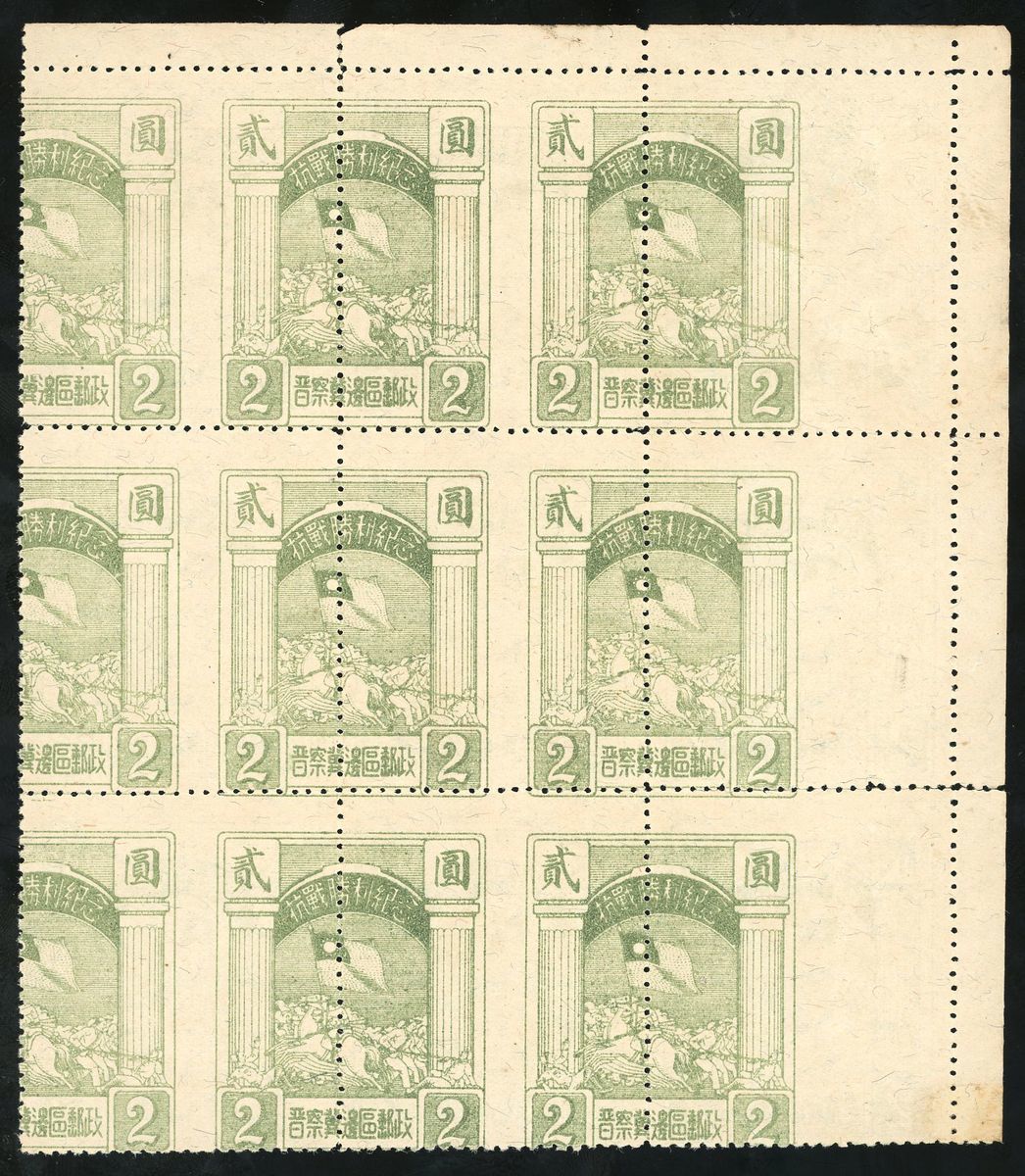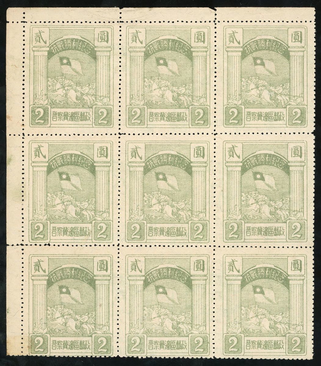 1945年華北解放區晉察冀邊區郵政大抗戰紀念2元新票九方連1件,帶左上直角邊紙,雙面印變體,圖案顏色鮮豔,齒孔完整,保存完好,少見