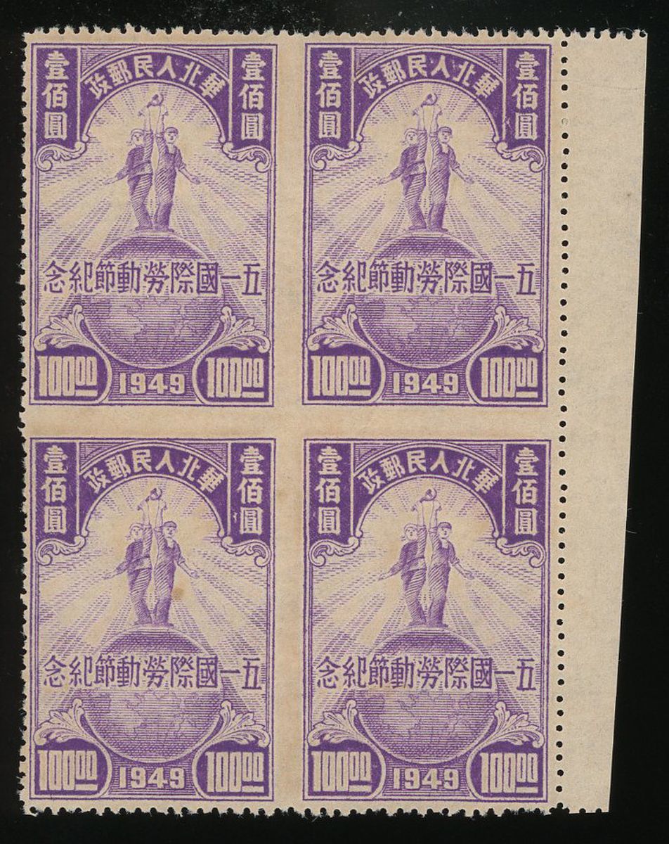 People's Post: 1949 International Labour Day set of five in blocks of four, all with left or right margin and $80 in a lower corner block. Yang NC370-374