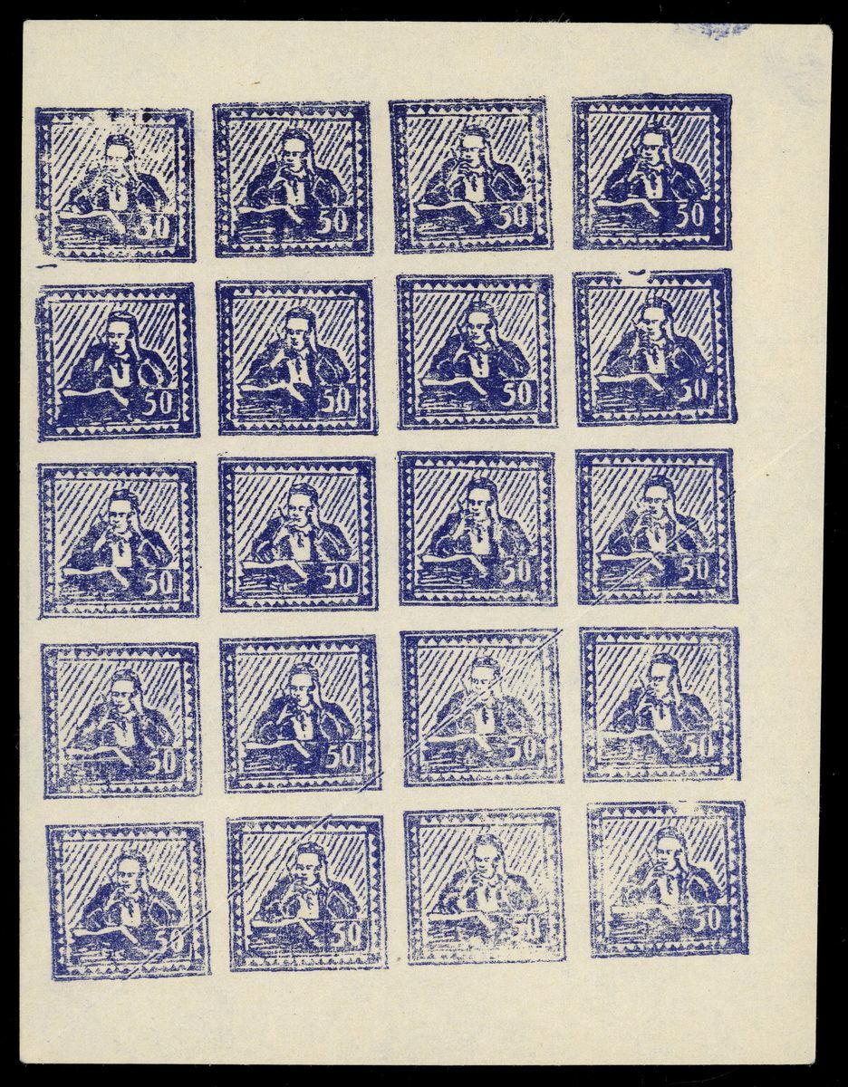 1949 Yili-Tacheng-Artai Area, workers design $50 blue, pane of twenty, unused, very fine. Yang NW103